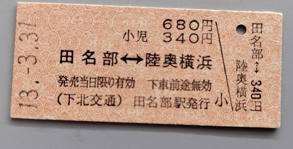 【平成13年に廃止 最終日の日付です 額面680円】下北交通田名部駅発行 田名部駅‐陸奥横浜駅 未使用 硬券普通連絡乗車券