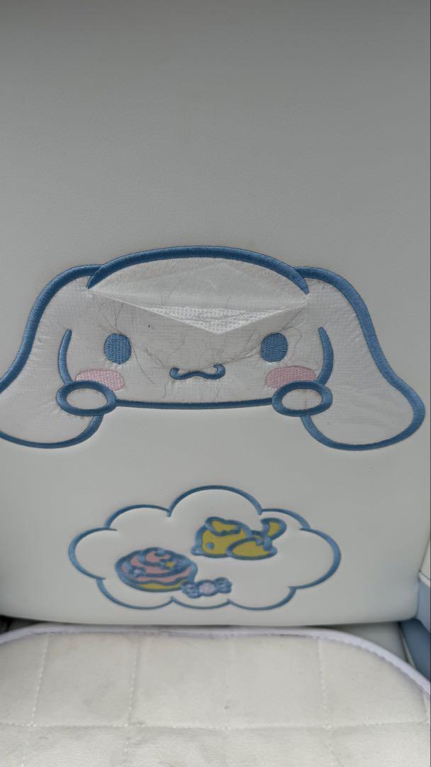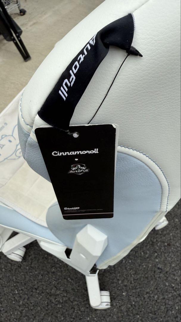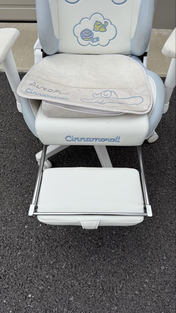シナモロールデザインのゲーミングチェア、キャラクター刺繍付き。