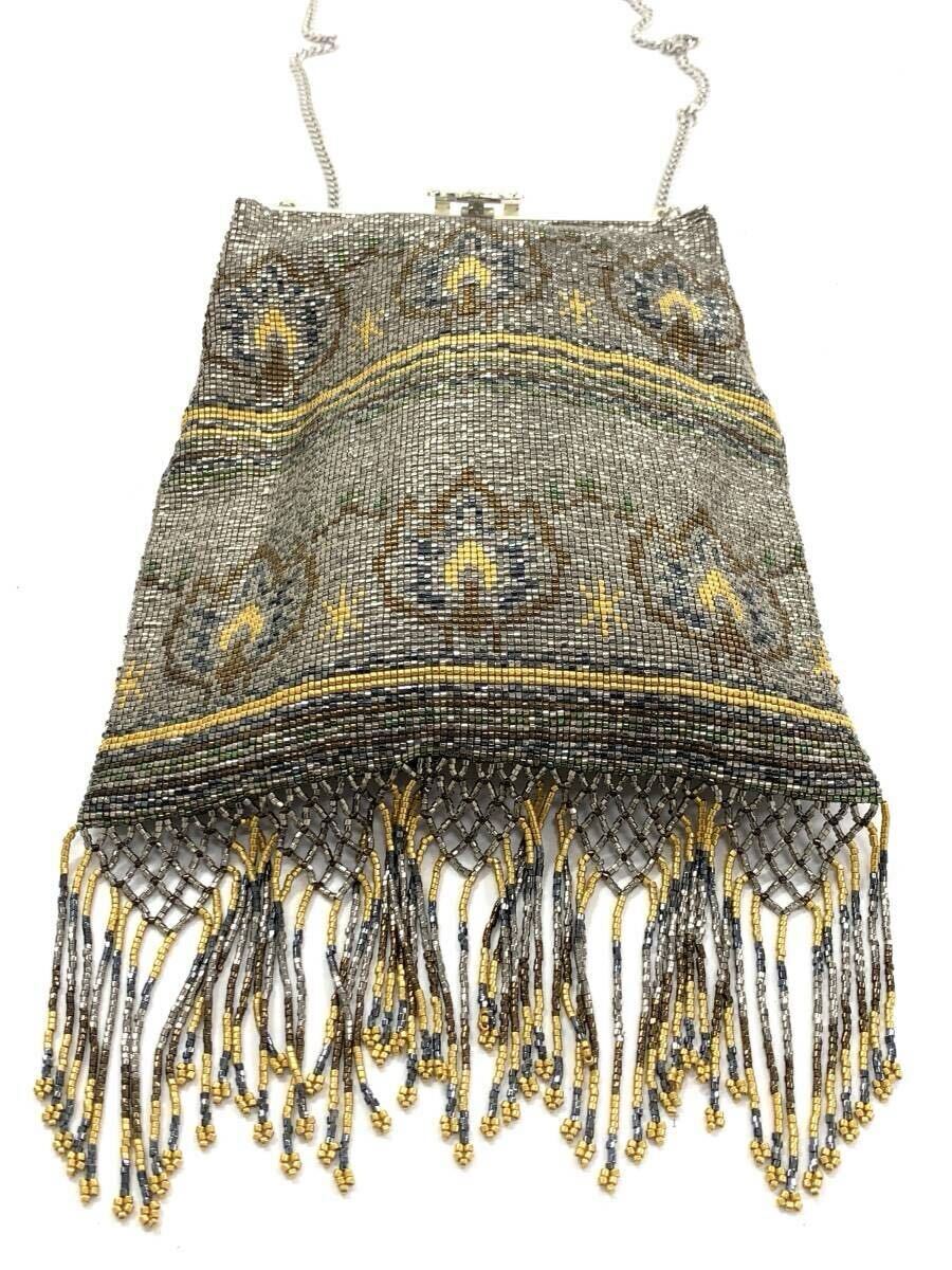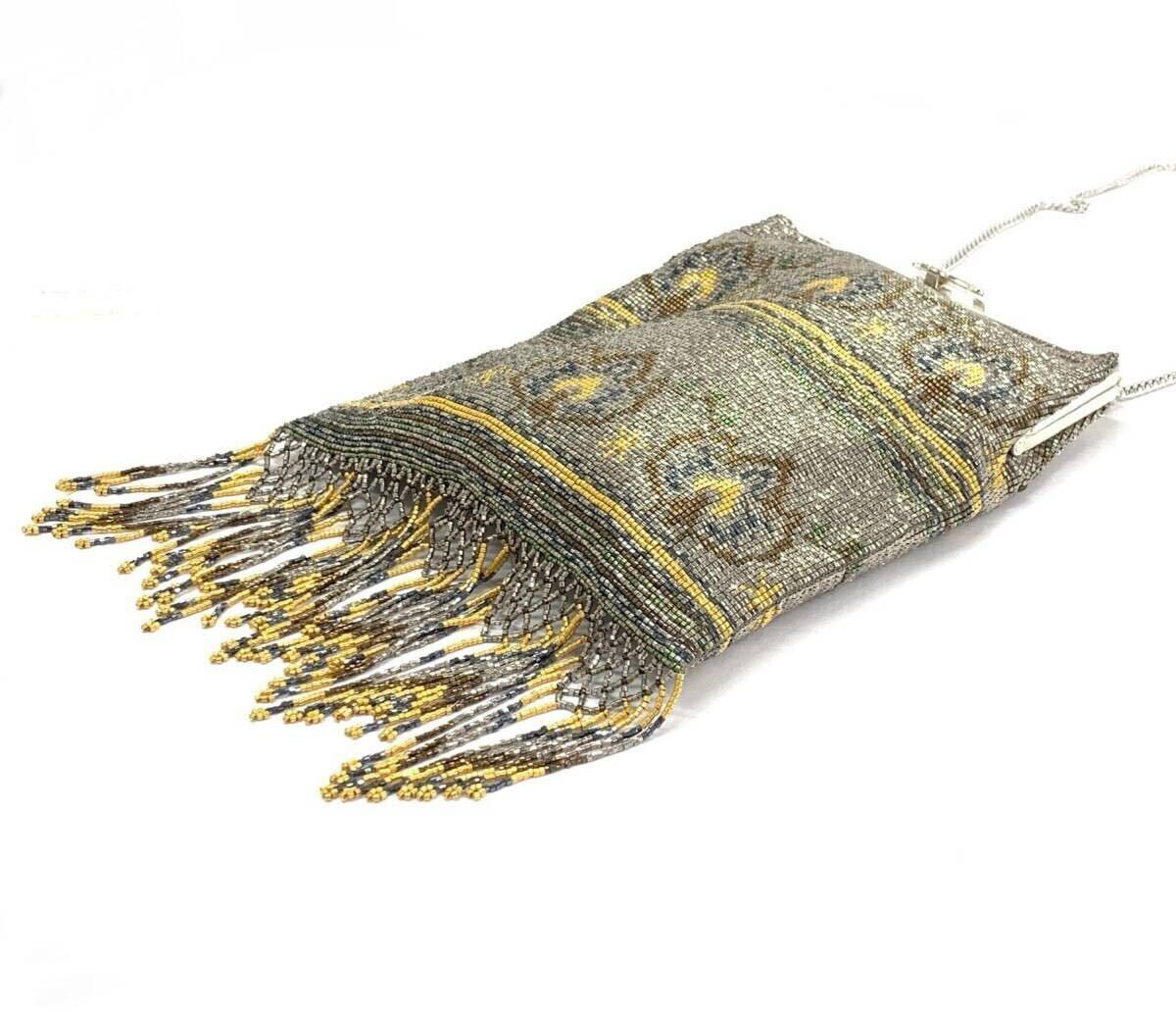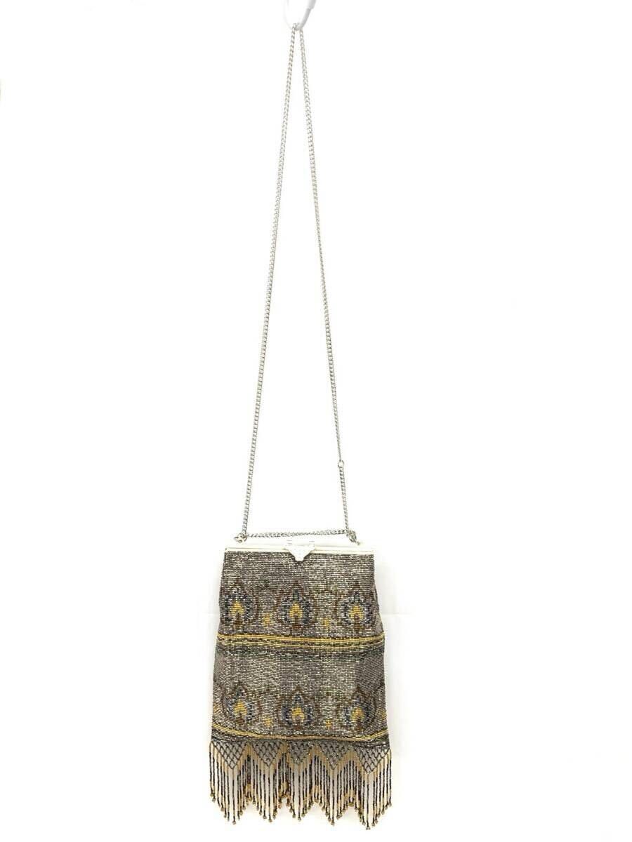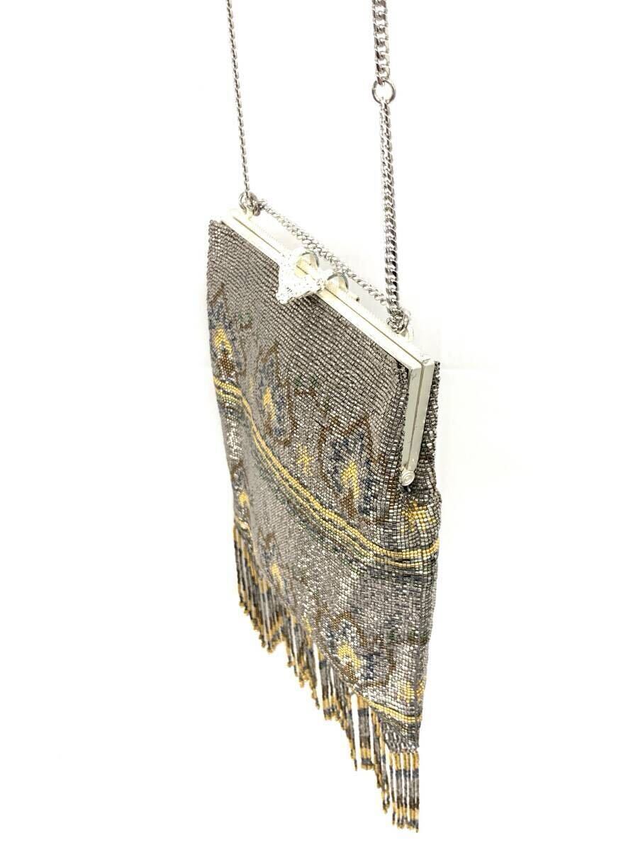 T08/197 サコタカコ メタルビーズバッグ フリンジ ポーチ パーティーバッグ シルバー ビーズバッグ がま口 レトロ