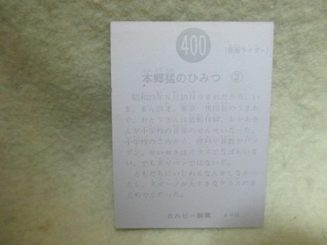 昔のカルビー仮面ライダーカードです。番号は「400番」となります。目立った汚れはありません。