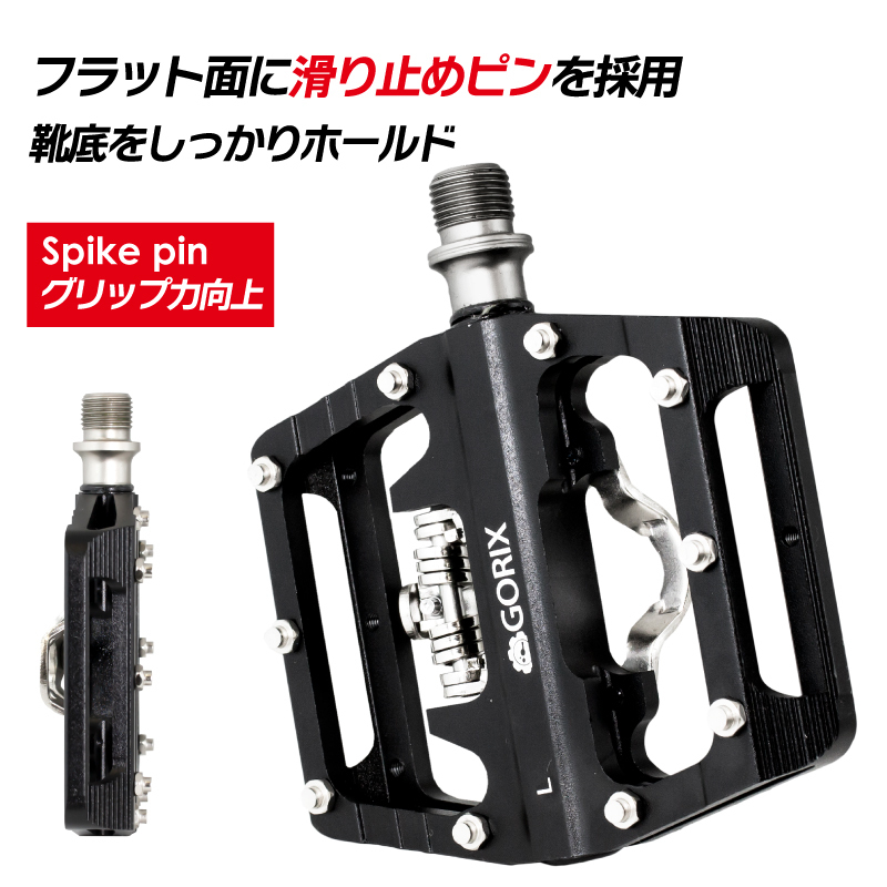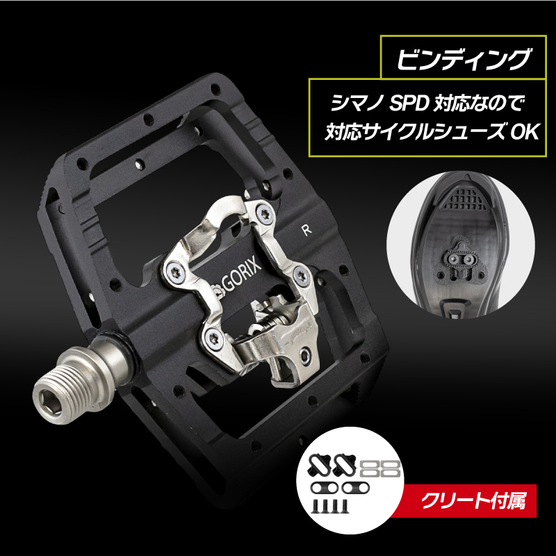 様々なタイプのシューズで使える両面ペダル。 サイクリングなどでのサイクルシューズ2穴クリートで使えるビンディンペダル。 通勤や街乗りなど普段のシューズで使えるフラットペダル。 ロードバイクやクロスバイク、マウンテンバイクなどの自転車に。 [ビンディング] シマノSPD対応なのでクリートをお持ちならそのままでOKです。 クリートは付属もしています。 テンション調整も可能でクリート着脱の強弱を調整できます。 [幅広タイプ] 踏み面が広くペダリングの安定性が向上。 踏む力を逃がしにくいので効率の良いペダリングが可能に。 [滑り止め] フラット面にはスパイクピンを配置していて 靴底をしっかりとホールドします。 [六角レンチで着脱] 六角レンチで取付けが可能です。 (おすすめ)ペダルの交換時にグリスを塗ると固着を防止するのでグリスは塗っておく事をおすすめします。 商品内容ペダル、クリート、クリート取付金具 ペダルタイプ両面(ビンディング・フラット) ペダルサイズ長さ108x幅100mm, 厚み約18mm 軸長56mm ペダル軸サイズ9/16 材質アルミニウム合金本体、クロモリ鋼軸軽量 / PU/sealedベアリング ペダル重量約452g/ペア カラーブラック  |       |