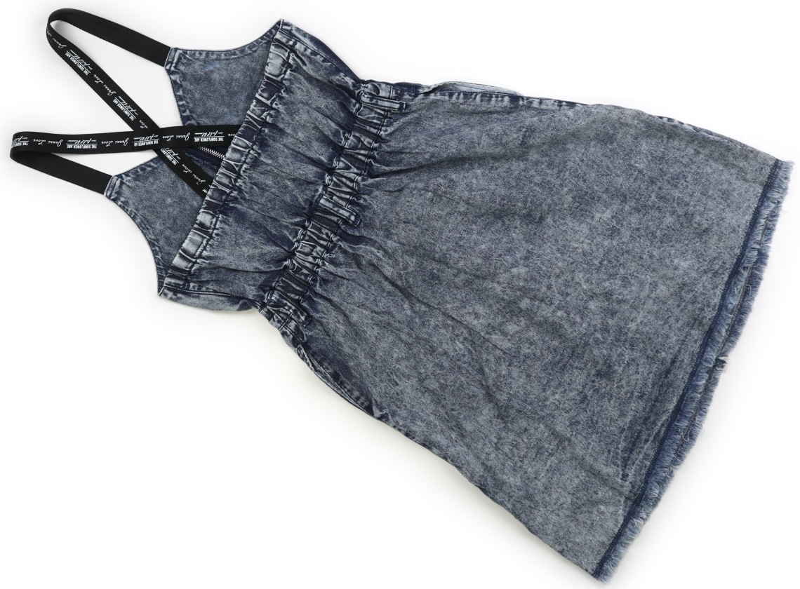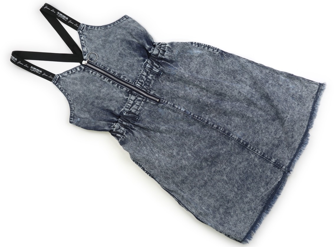 ダンガリー地で、前ファスナー開き。ウエストにゴムが入ってます。肩紐の調節が可能です。使用感が見られますが、目立つ汚れはなく、まだまだお使いいただけます。