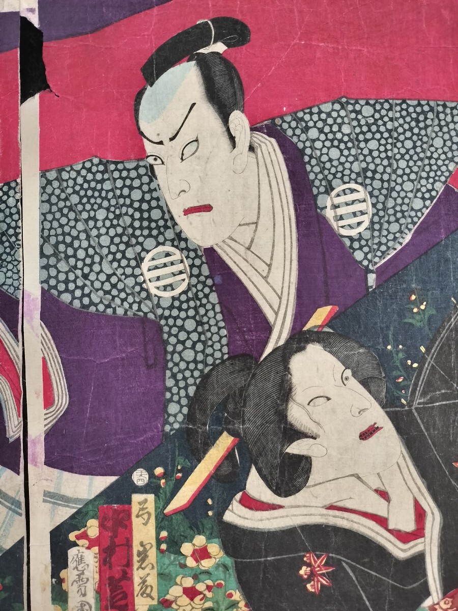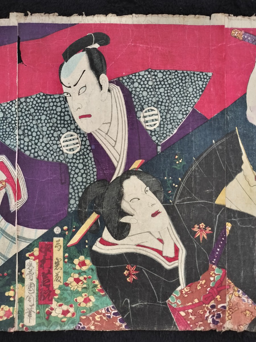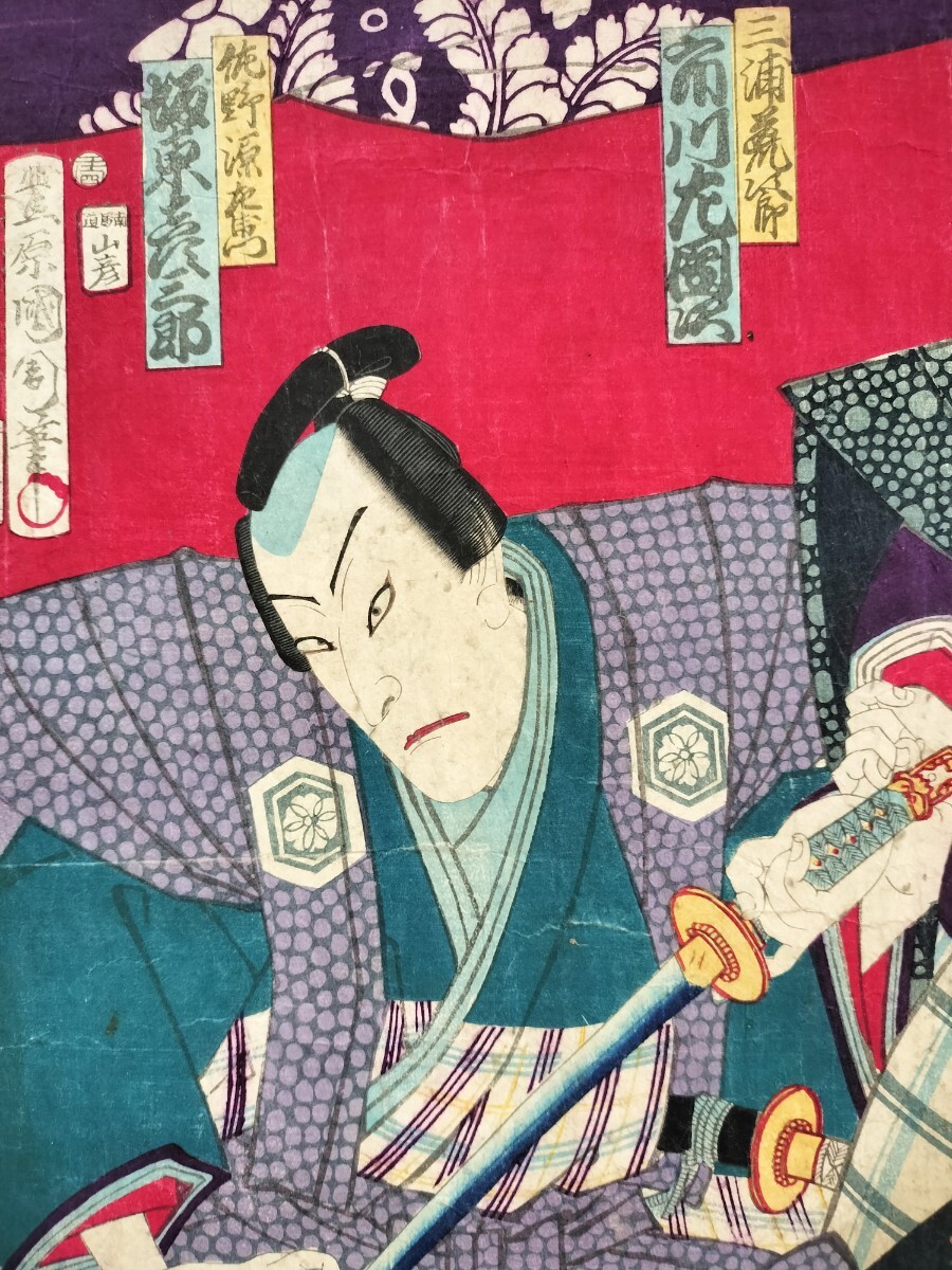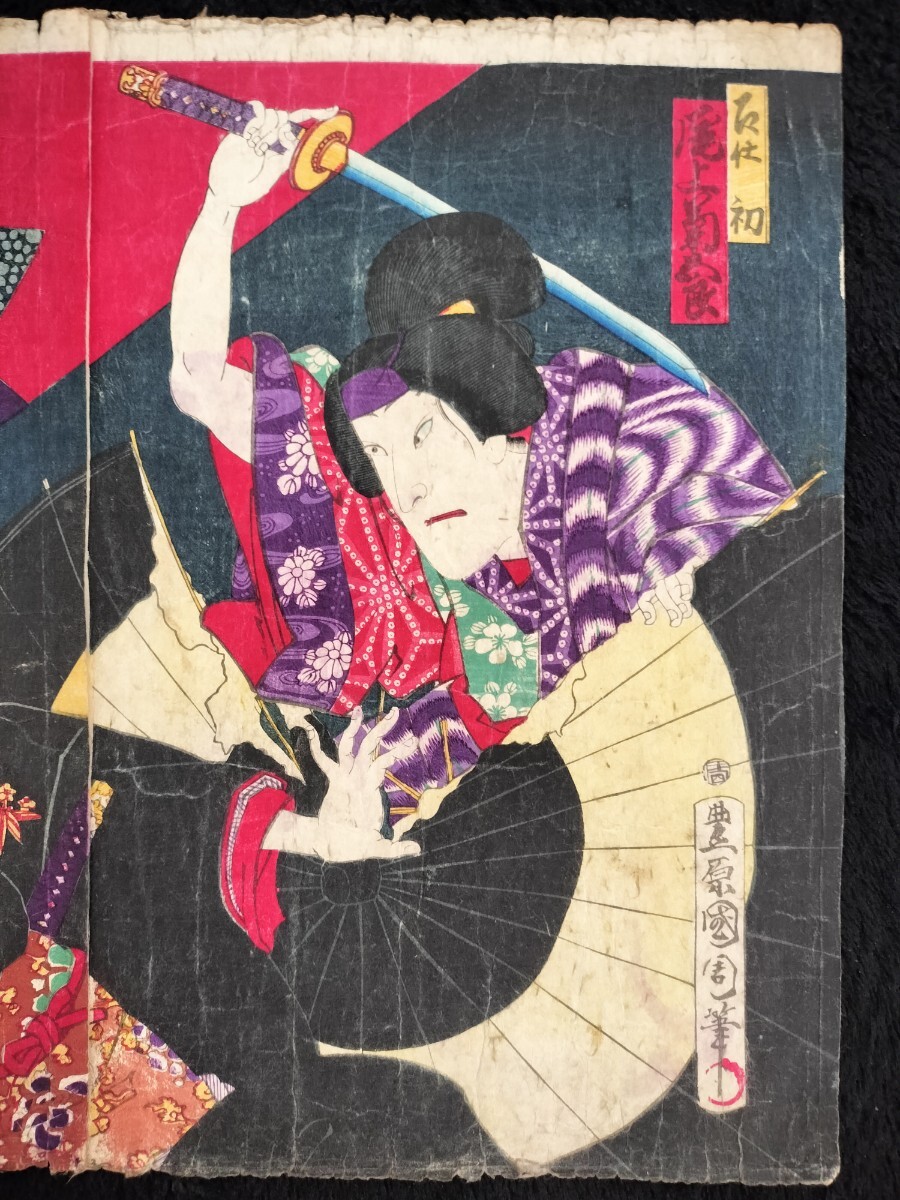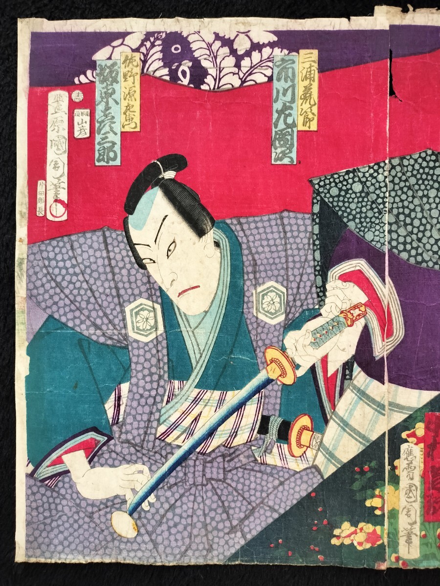 明治期/真作 豊原国周「尾上菊五郎」本物浮世絵木版画 歌舞伎絵 役者絵 芝居絵 錦絵 大判 裏打ち 三枚続き
