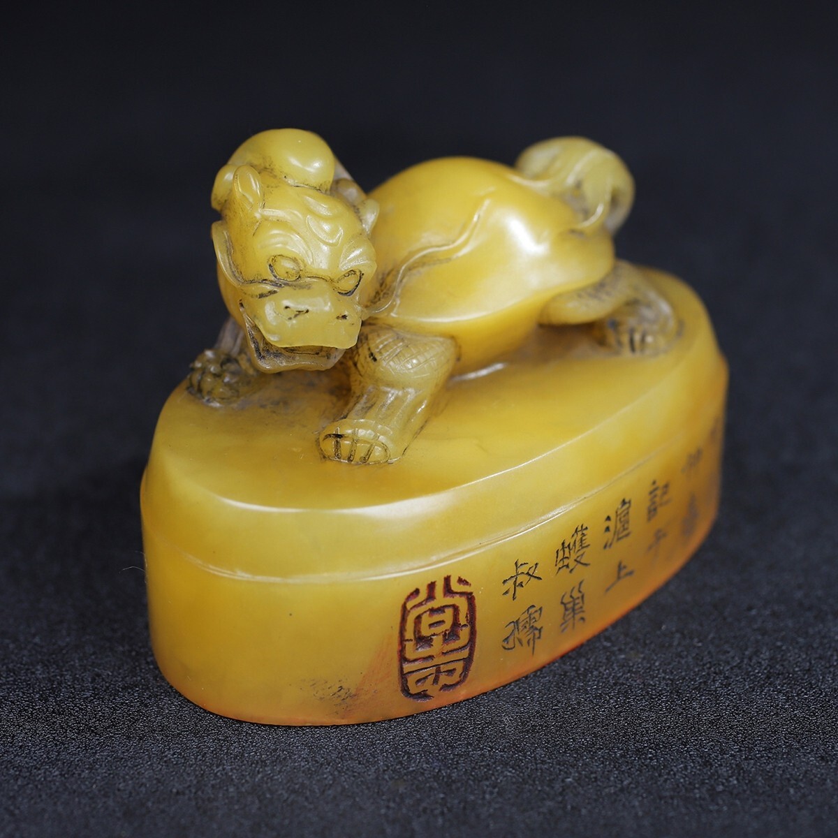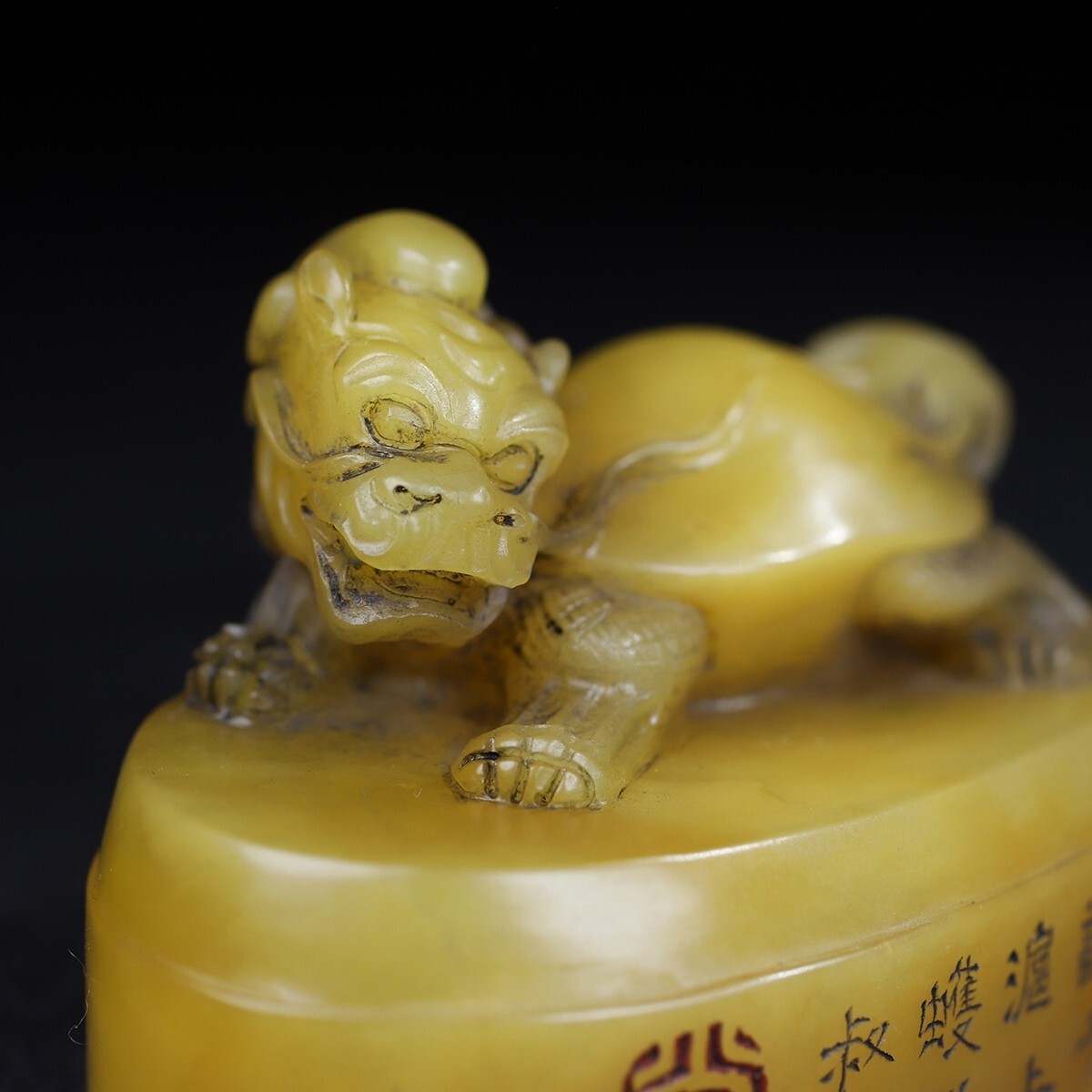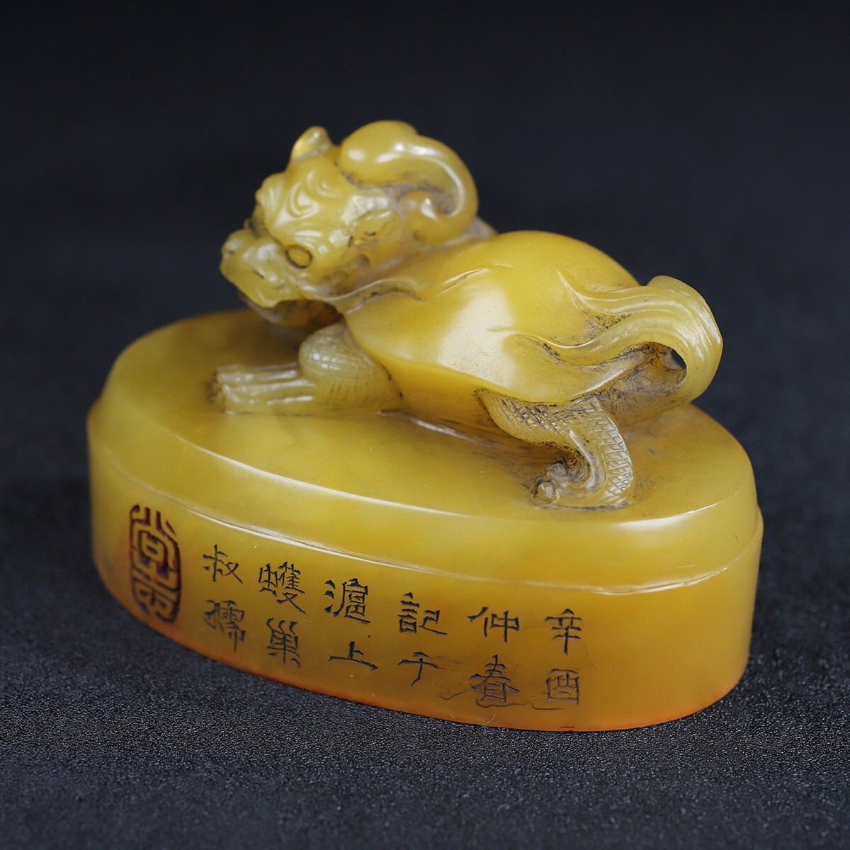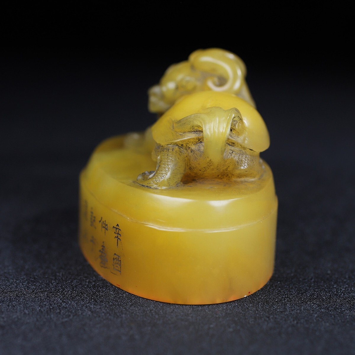 「清末民初 叔孺篆 老寿山石 田黄石彫り 龍竜鈕印章」極細工 擺件 古賞物 中国古美術 旧蔵出