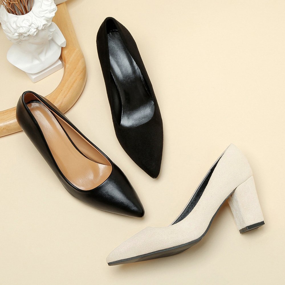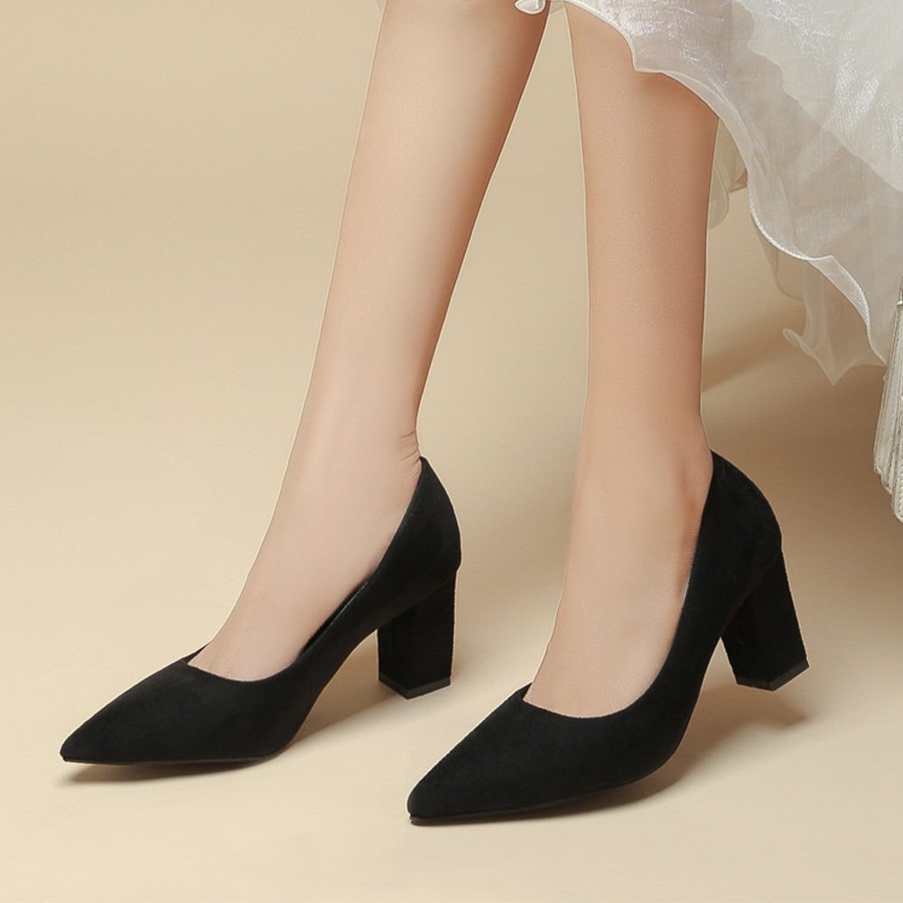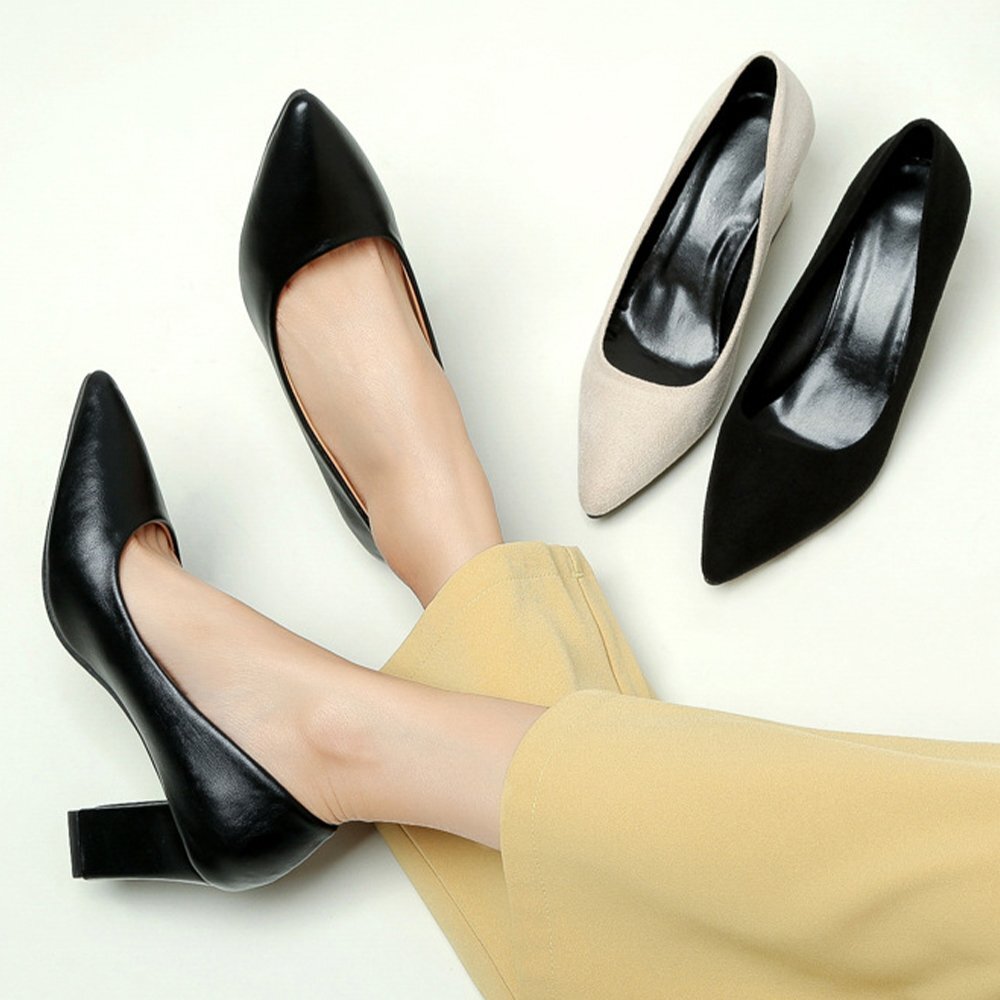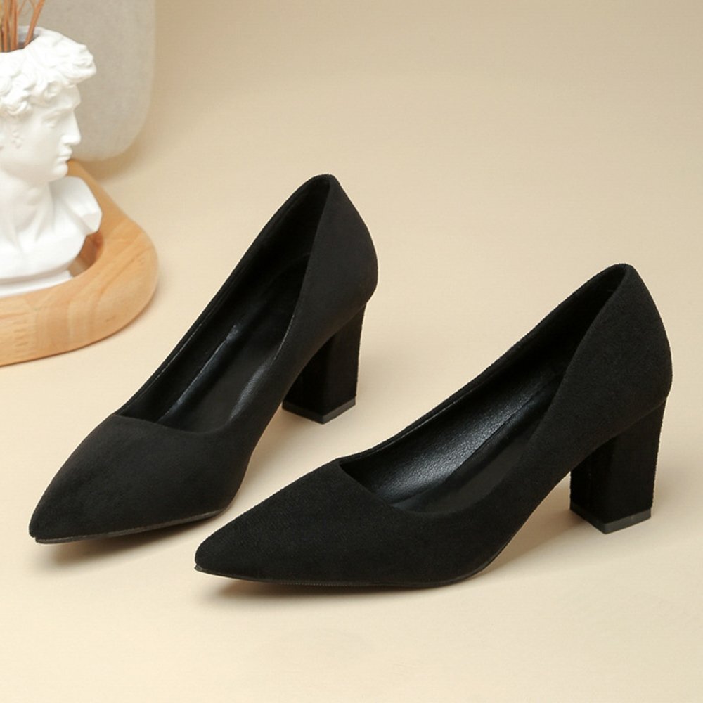 ポインテッドトゥ シューズ チャンキーヒール OL カジュアル お洒落 大人 疲れにくい 歩きやすい PU スエード