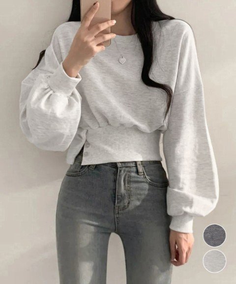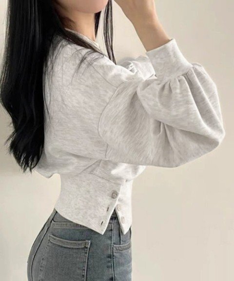 ウエストのシングルブレストデザインがひとクセある韓国風トレーナー