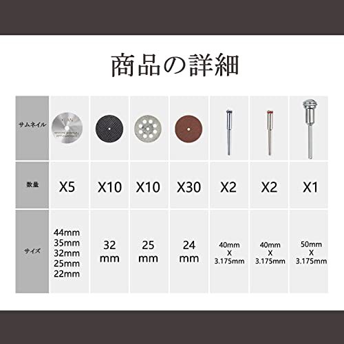 • 【パッケージ】5枚小径丸鋸刃、10枚ダイヤモンドカッター、10枚黑い脂砥石、30枚赤い脂砥石、3mm軸*5本。