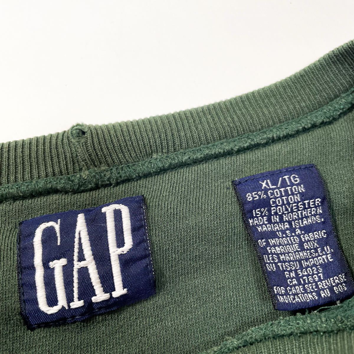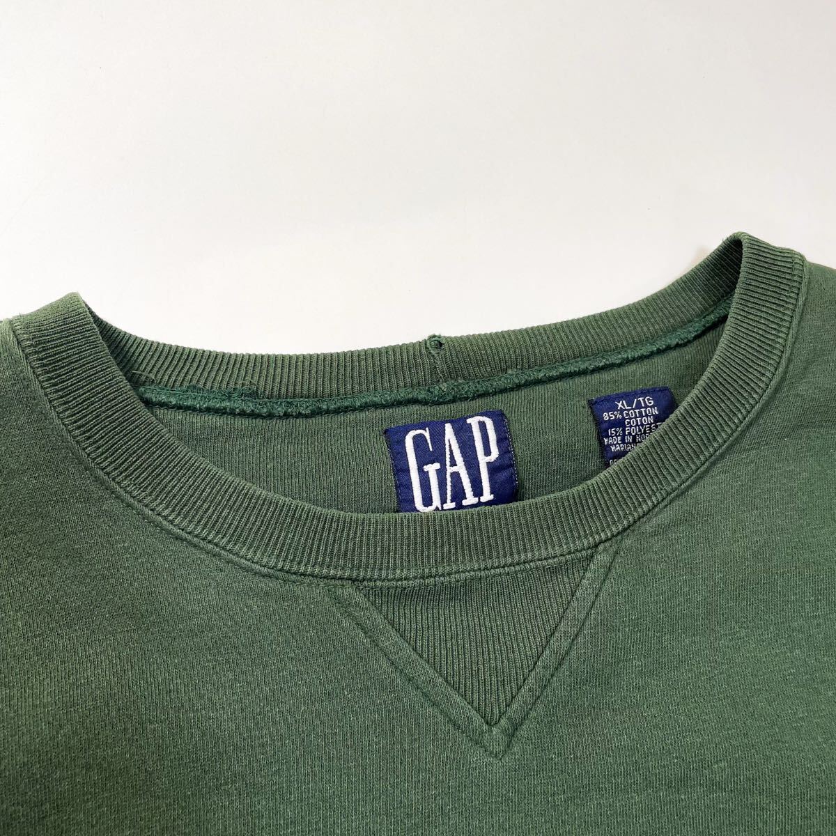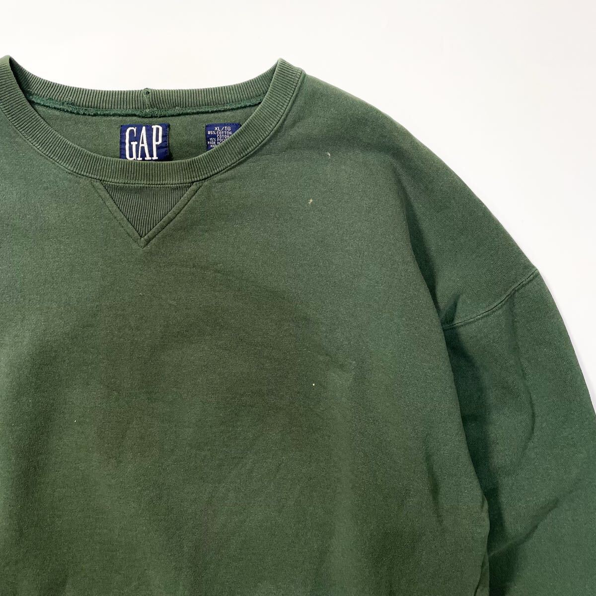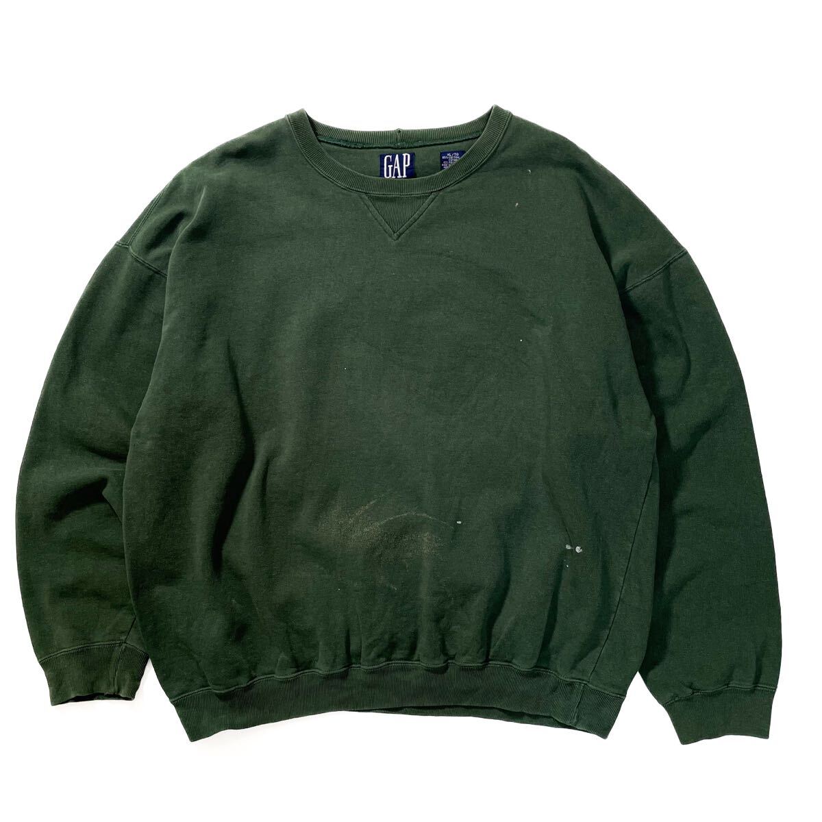 80s 90s GAP 前v スウェット トレーナー クルーネック フェード グリーン ビンテージ アメリカ製 usa old XL 無地 ギャップ ラッセル 00s