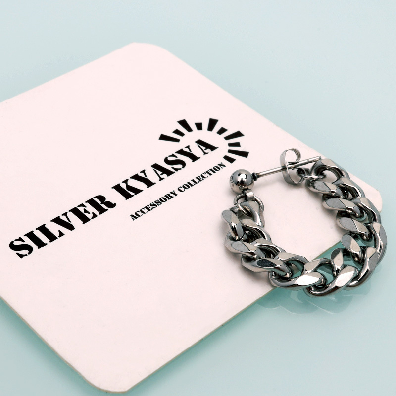 幅7mmの喜平チェーンをフープ状にセットした迫力たっぷりなデザインのピアス。動くたびに揺れ動き耳元への注目を引くアイテム。