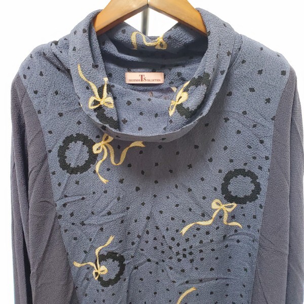 #anc Ts コレクション 詩仙堂 ヒトシタムラ チュニック 青 グレー ちりめん ドルマン 切替 リボン柄 レディース [955058]