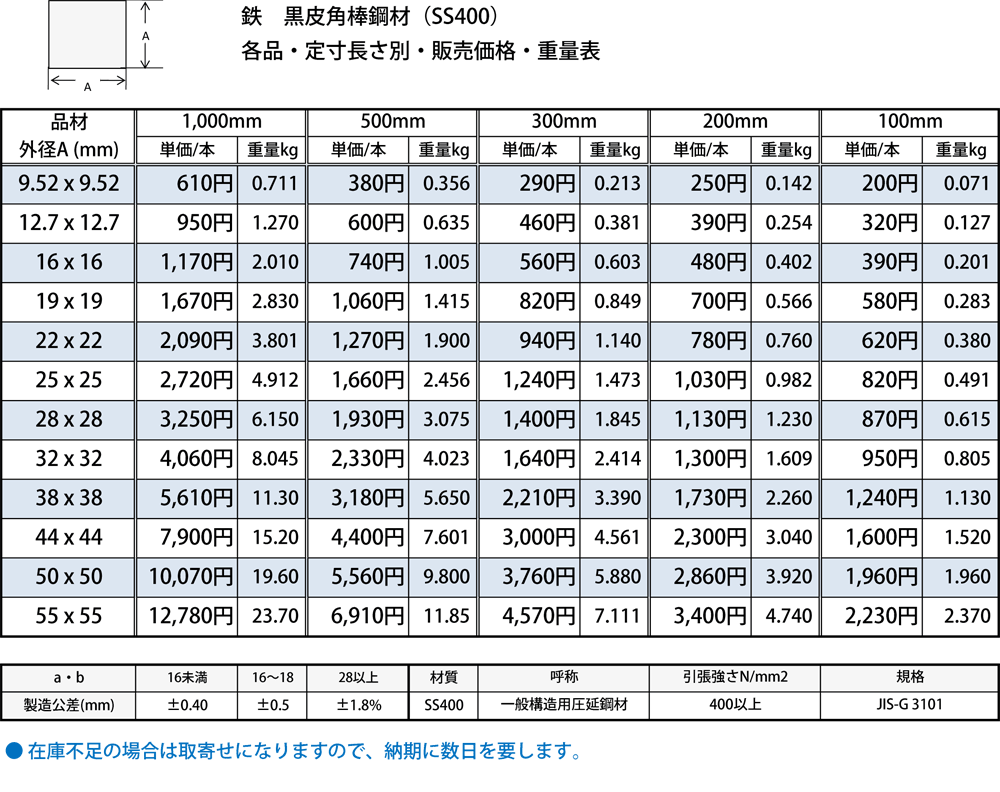 鉄黒皮 四角棒鋼(SS400)普通鋼材 各形状の
