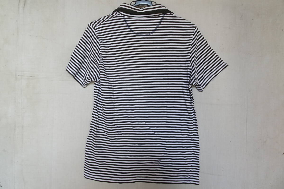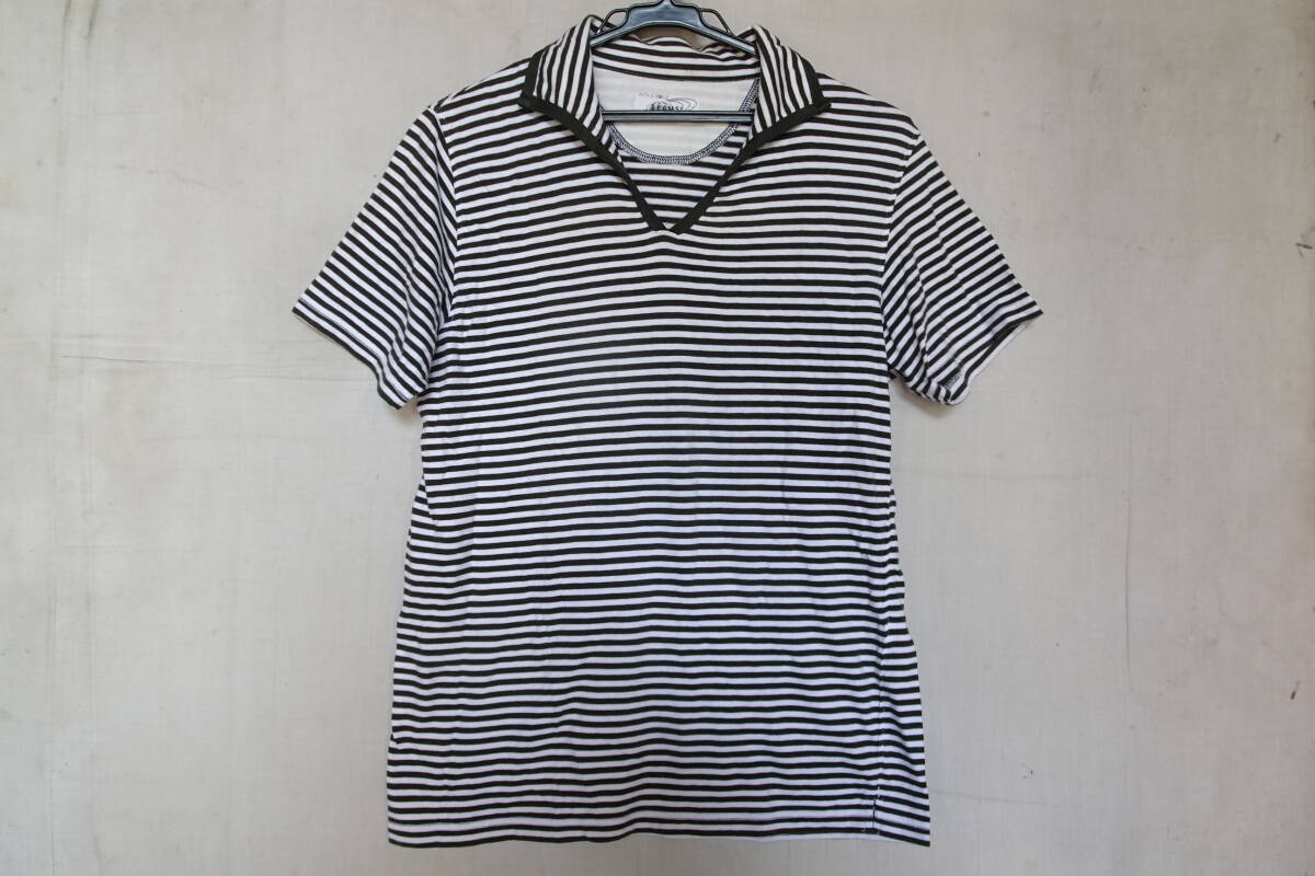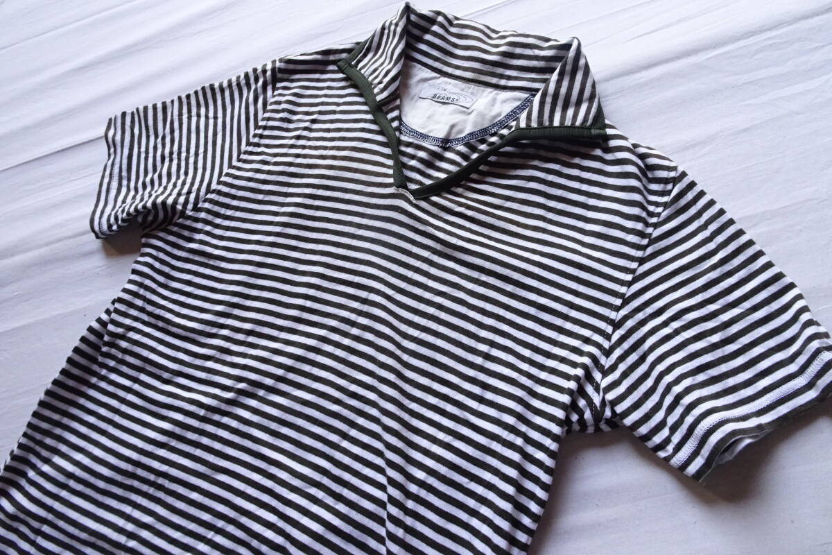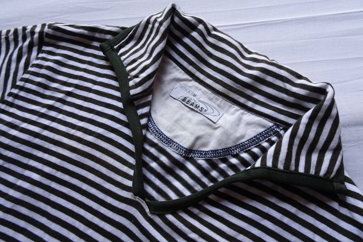 BEAMS/ビームス/襟付半袖Tシャツ/カットソー/スキッパー襟/ボーダー柄/裾サイドスリット/カーキ/白/ホワイト(9/9R7)