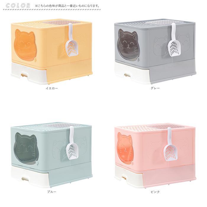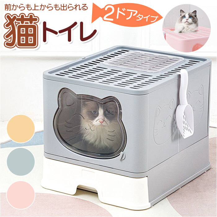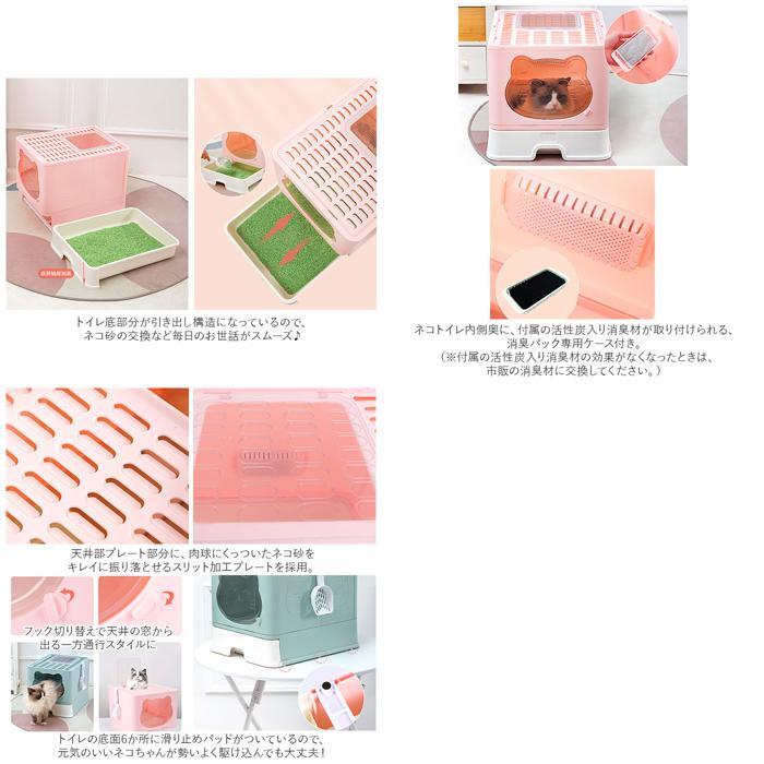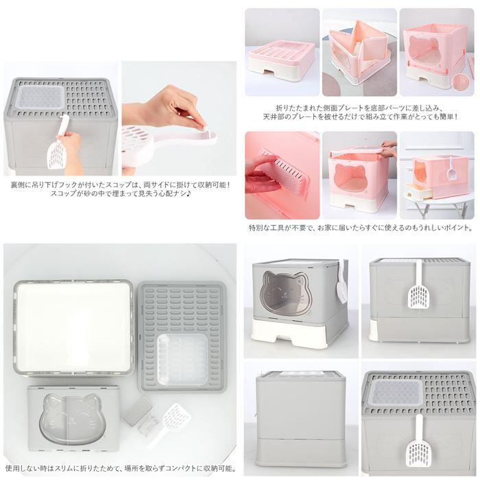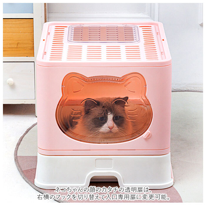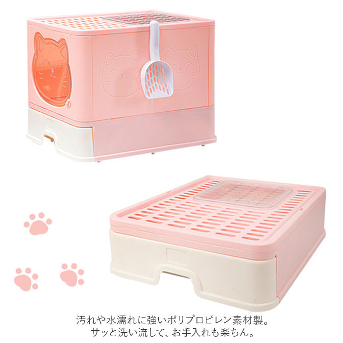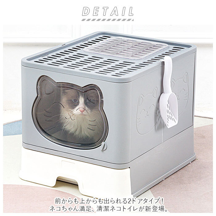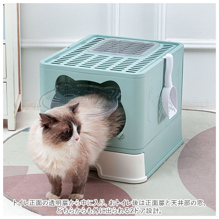 商品説明 | ・・前からも上からも出られる2ドアタイプ!ネコちゃん満足、清潔ネコトイレが新登場。 ・トイレ正面の透明扉から中に入り、おトイレ後は正面扉と天井部の窓、どちらからも外に出られる2ドア設計。もぐったり登ったりが好きな、活発に動くネコちゃんにぴったり。 ・ネコちゃんの顔のカタチの透明扉は、右横のフックを切り替えて入口専用扉に変更可能。天井部の窓から出る一方通行スタイルにすれば、ネコ砂の飛び散りも防止! ・中に入ったネコちゃんが、落ち着いてトイレと砂かきができるゆったり広々空間。 ・トイレ底部分が引き出し構造になっているので、かがみこんだり、トイレの奥まで手を伸ばす手間がなく、ネコ砂の交換など毎日のお世話がスムーズ♪ ・天井部プレート部分に、肉球にくっついたネコ砂をキレイに振り落とせるスリット加工プレートを採用。ネコ砂の飛び散りをダブルで防ぐから、毎日のお掃除の手間が軽減。 ・汚れや水濡れに強いポリプロピレン素材製。水でサッと洗い流して、お手入れも楽ちん。 ・ハンドル裏側に吊り下げフックが付いたネコ砂スコップは、天井部両サイドに掛けて収納可能!スコップが砂の中で埋まって見失う心配ナシ♪ ・ネコトイレ内側奥に、付属の活性炭入り消臭材が取り付けられる、消臭パック専用ケース付き。(※付属の活性炭入り消臭材の効果がなくなったときは、市販の消臭材に交換してください。) ・トイレの底面6か所に滑り止めパッドがついいているので、元気のいいネコちゃんが勢いよく駆け込んでも大丈夫! ・折りたたまれた側面プレートを底部パーツに差し込み、天井部のプレートを被せるだけで組み立て作業がとっても簡単!特別な工具が不要で、お家に届いたらすぐに使えるもうれしいポイント。 ・使用しないときにはスリムに折りたためて、場所を取らずにコンパクトに収納可能。シンプルで使いやすいトイレで、ネコちゃんも飼い主さんもハッピーに♪ |