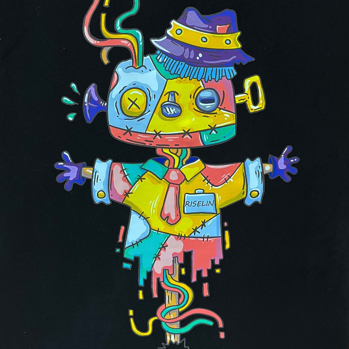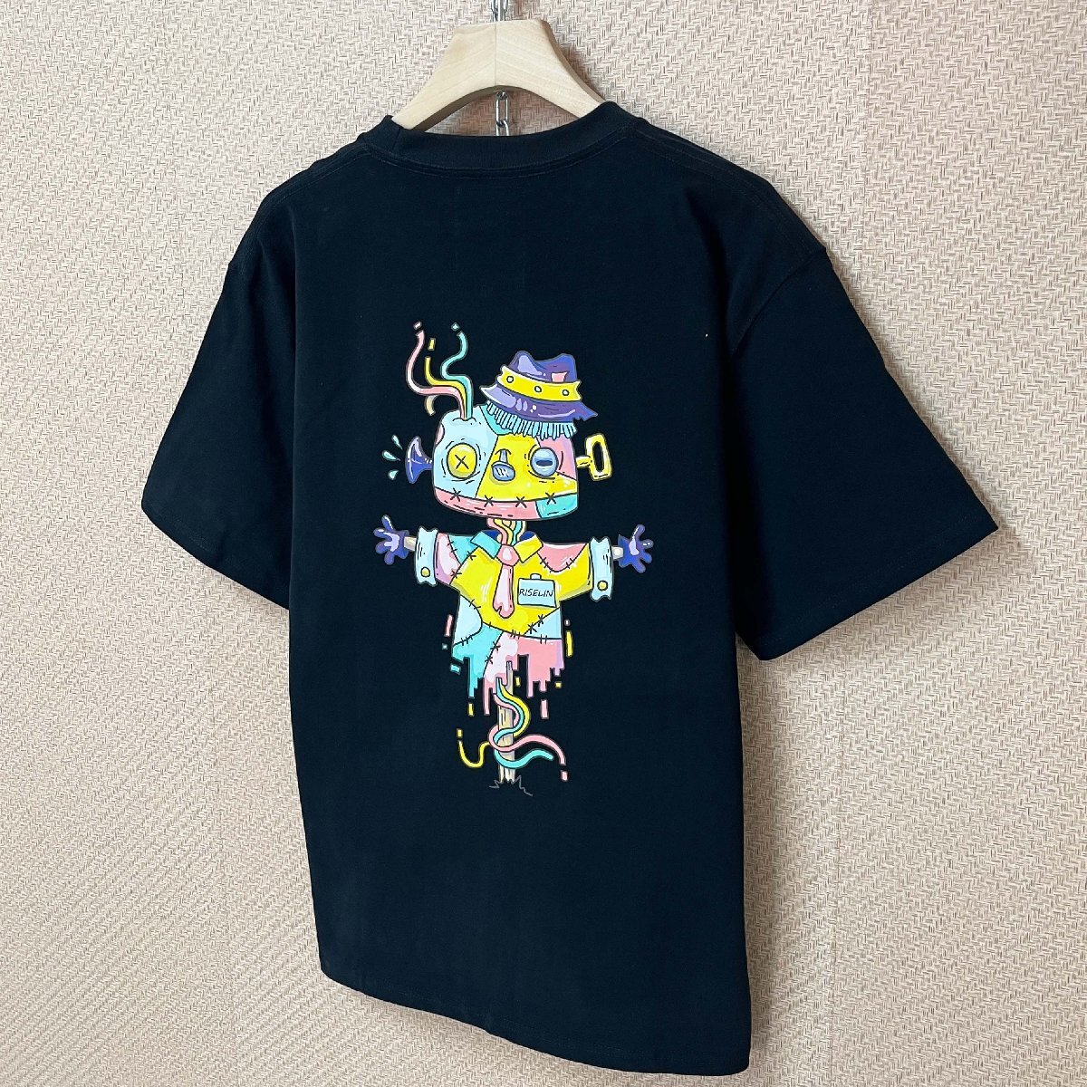 カラフルなかかしが背中で遊ぶ!男女兼用の半袖Tシャツ。