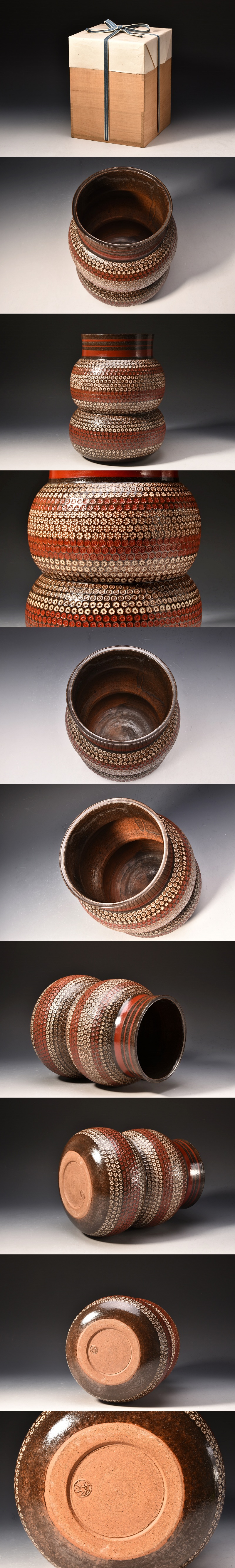 U08370 十代 大樋長左衛門 年朗 灰釉 加彩 花三島 壺 飾壺