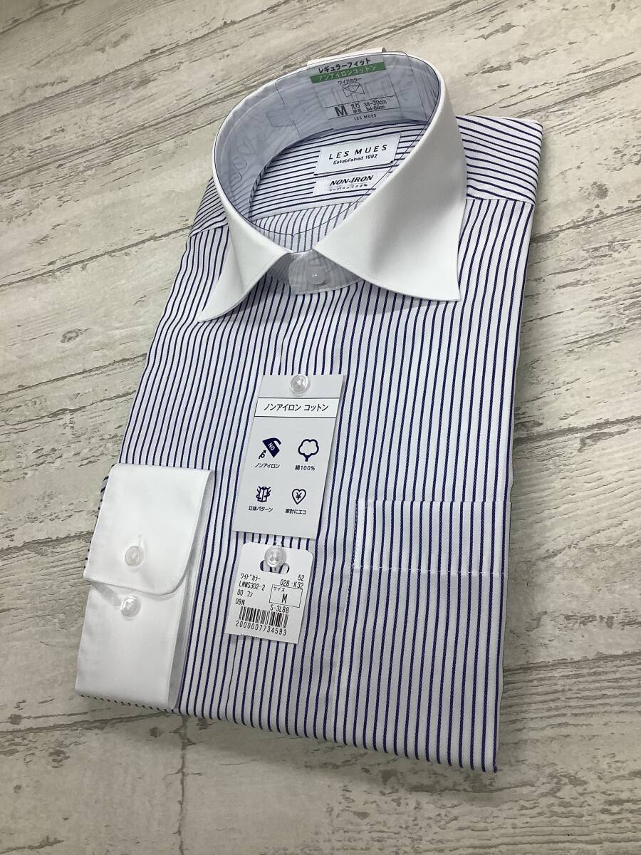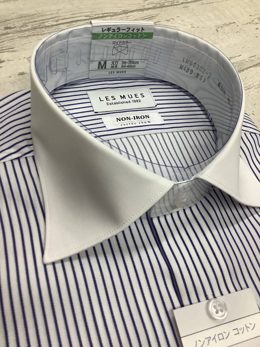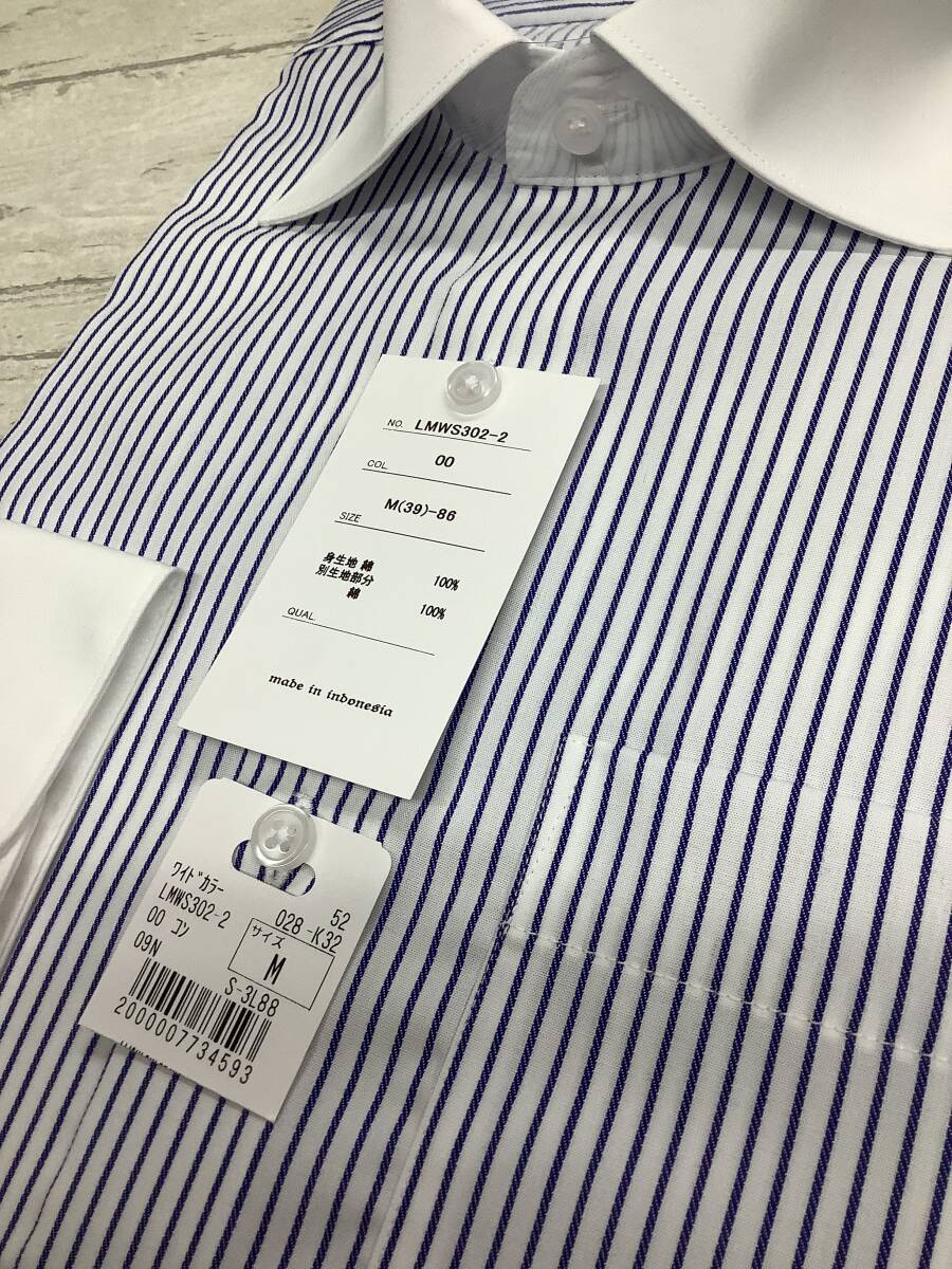 新品未使用 39-86 長袖 Mサイズ ワイドカラードレスシャツ ノンアイロンコットン 綿100% ★ブルーラインストライプ クレリックシャツ