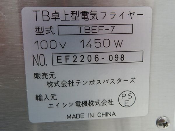 ◆テンポス 2022年◆卓上型電気フライヤー TBEF-7 100V 270×380×330 サイズ:W270×D380×H330(mm) 電 源:100V 油 量:7L 製品質量:6kg 出品にあたり動作確認・クリーニング済みです。 多少の傷・使用感等がありますので、予めご了承ください。 中古品ですので、画像をよくご確認の上、ご理解頂ける方のご入札をお願いいたします。 神経質な方はご入札をご遠慮ください。 気持ちの良いお取り引きにしたいと思いますので、ご不明な点等ございましたらお気軽にご質問ください。 | |