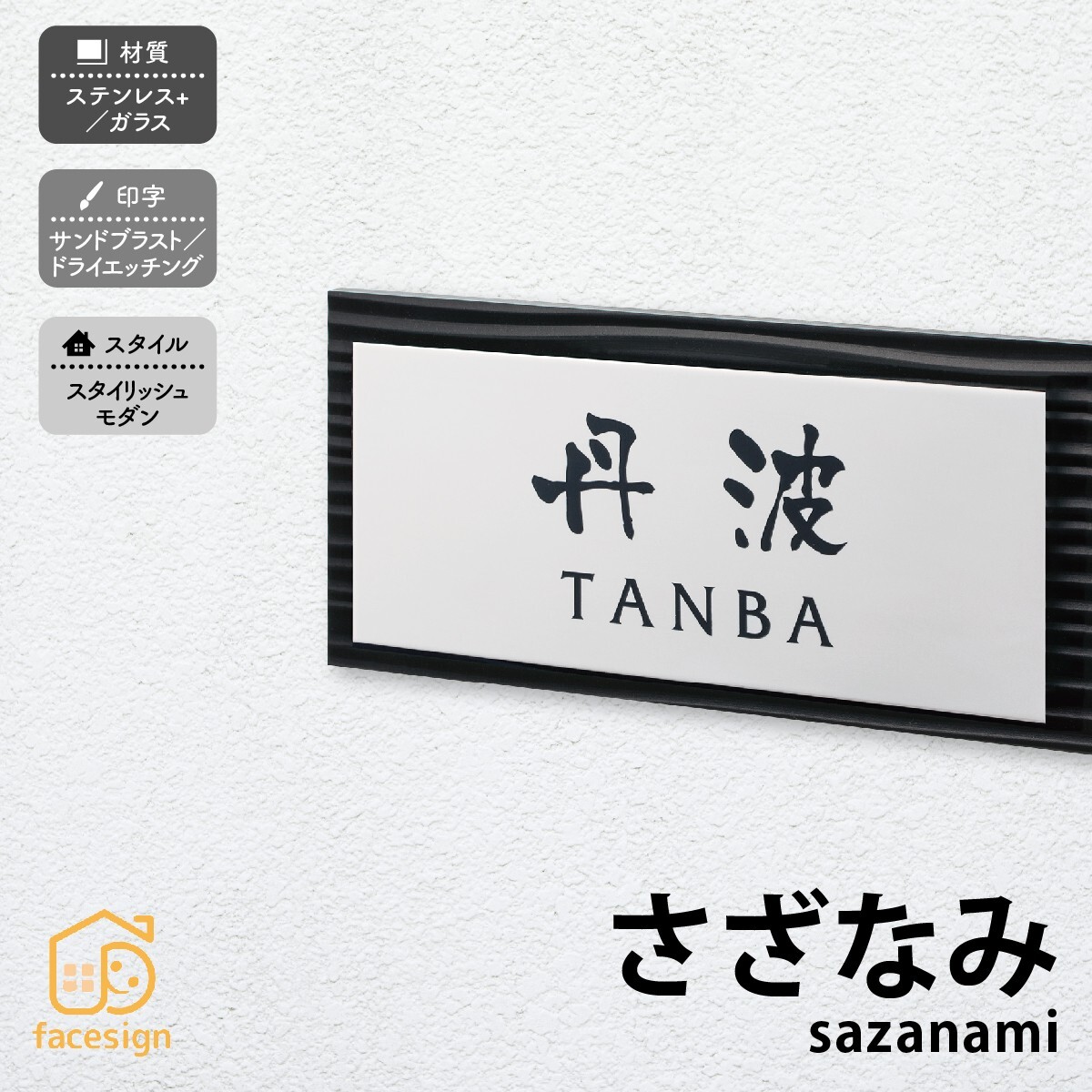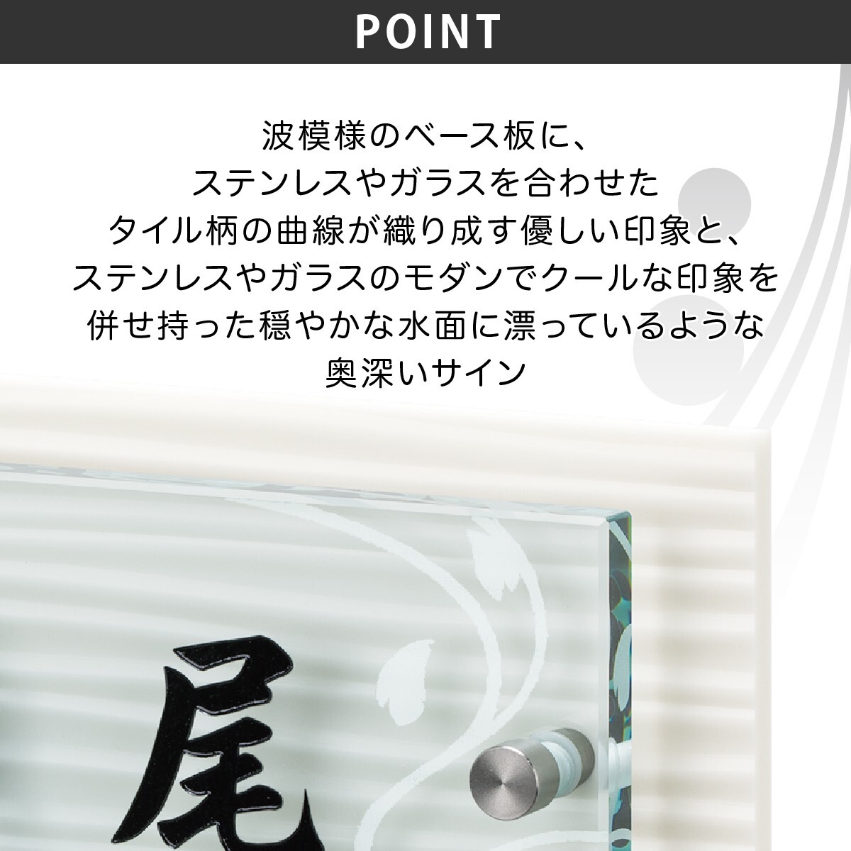 商品詳細 | 波模様のベース板に、ステンレスやガラスを合わせました。タイル柄の曲線が織り成す優しい印象と、ステンレスやガラスのモダンでクールな印象を合わせ持った奥深いサインです。 |