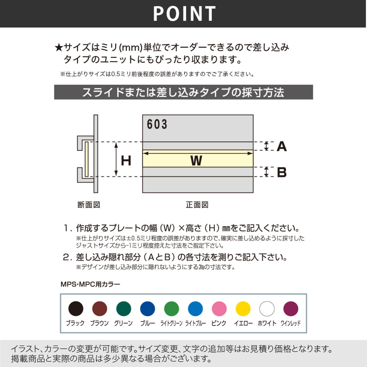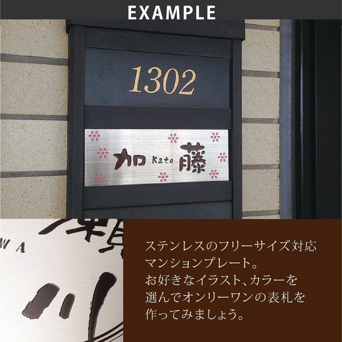 商品詳細 | ステンレスのフリーサイズ対応マンションプレートです。 お好きなイラスト、カラー(2色のみ)をお選びください。 サイズはミリ単位でオーダーできます。タイプのユニットにもピッタリ収まります。 |