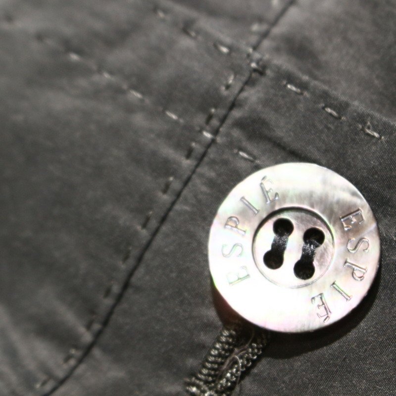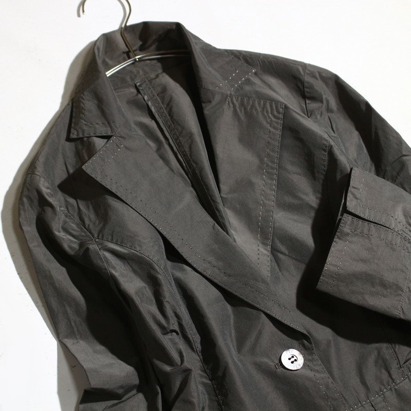 シャカシャカとした質感、若干の玉虫色の艶のある生地、ロゴ入りのシェル艶ボタン、軽く羽織れ季節の変わり目に活躍する1着です。