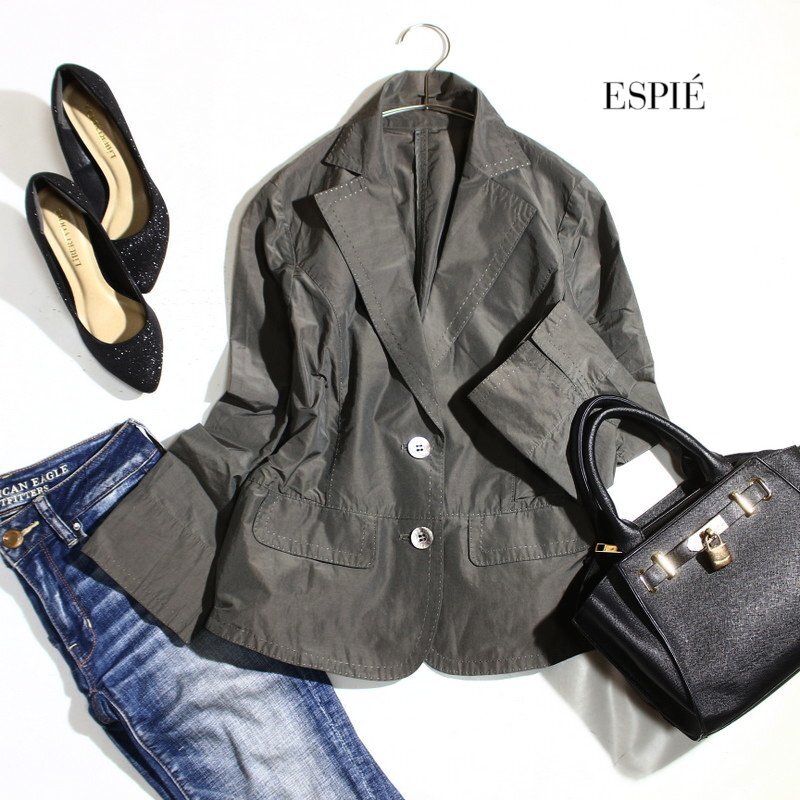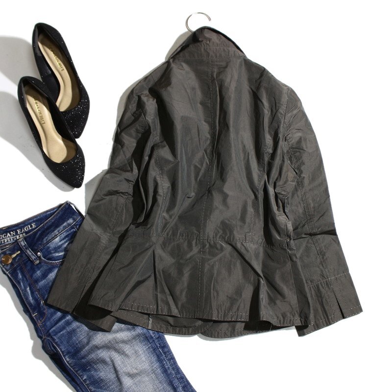 美品 ESPIE エスピエ イトキン(株) 合物 玉虫色 艶 ポリエステル コットン ジャケット 40 グレイッシュ カーキ グレー オフィス 通勤 秋 春