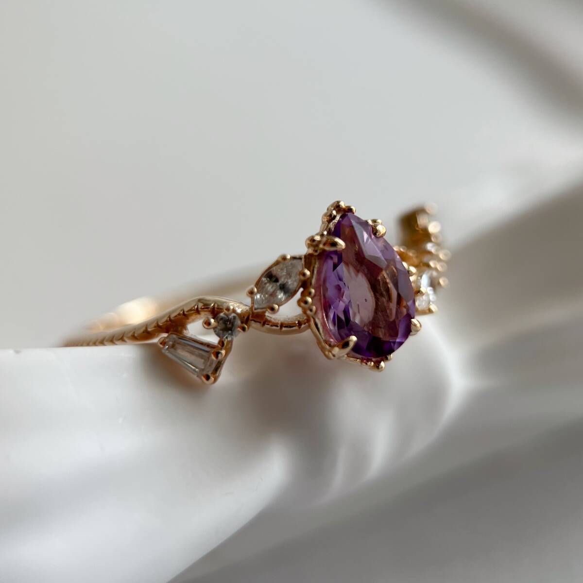 ドロップ型にカットされた大粒天然アメジストのリング。