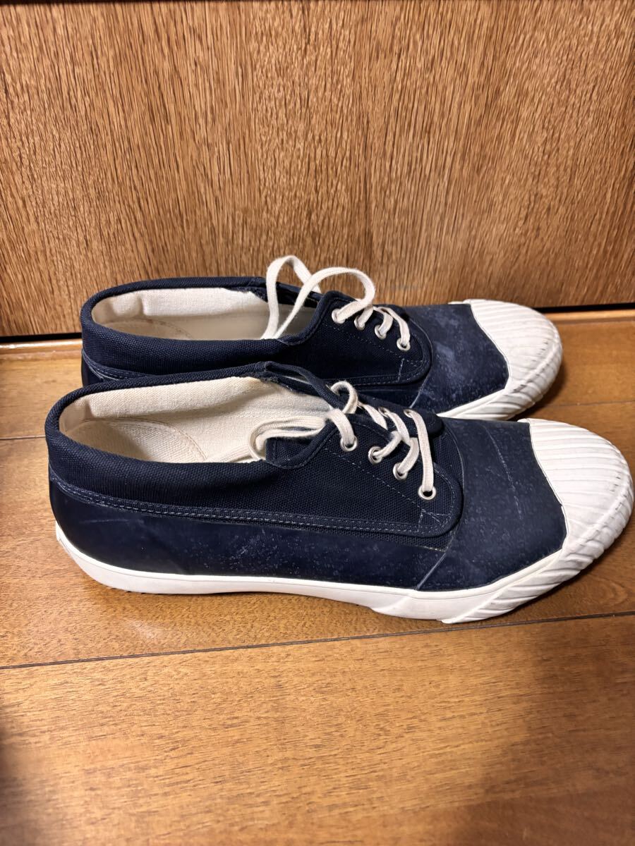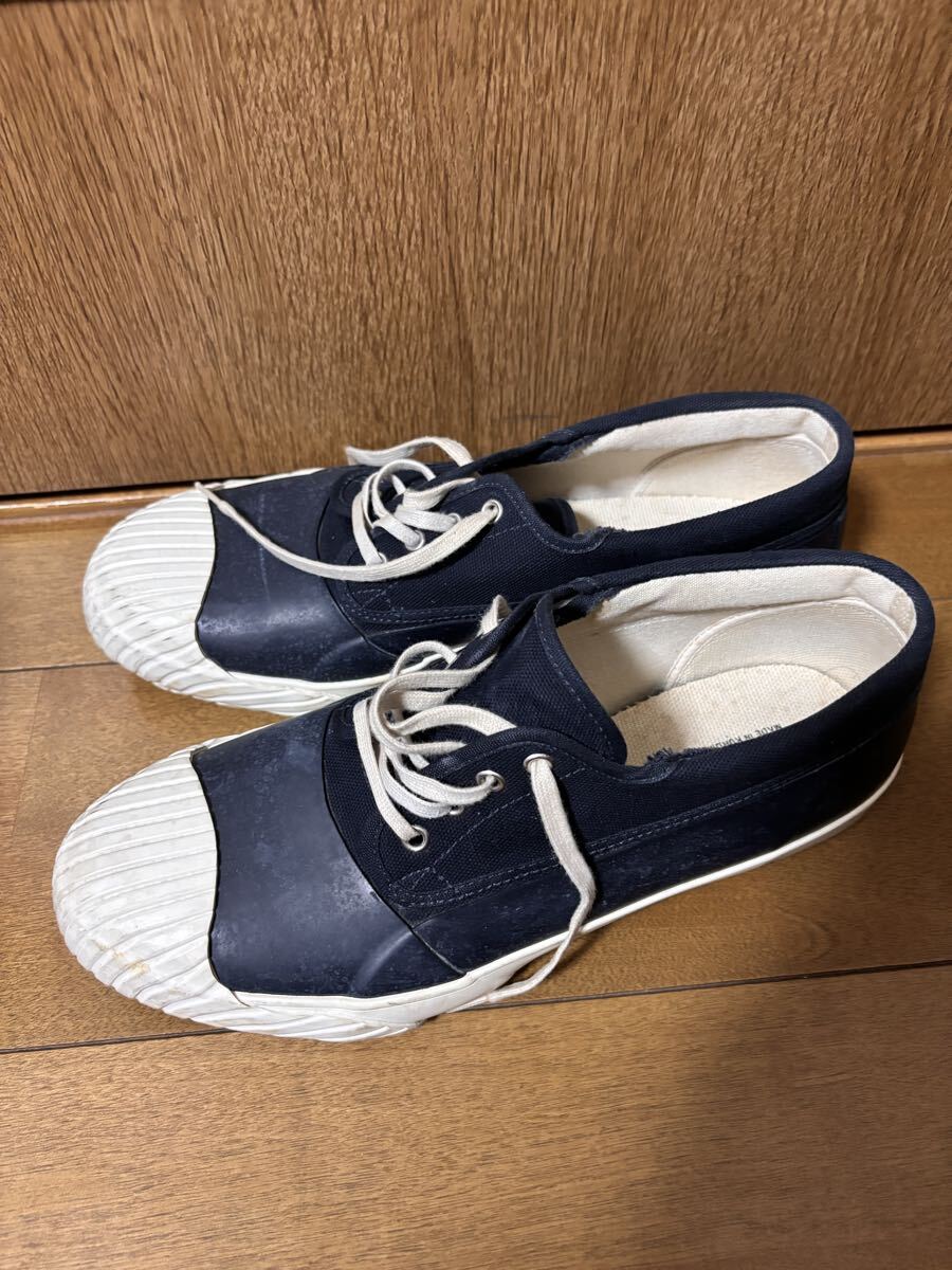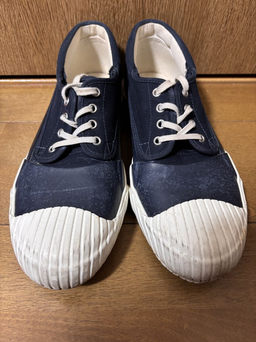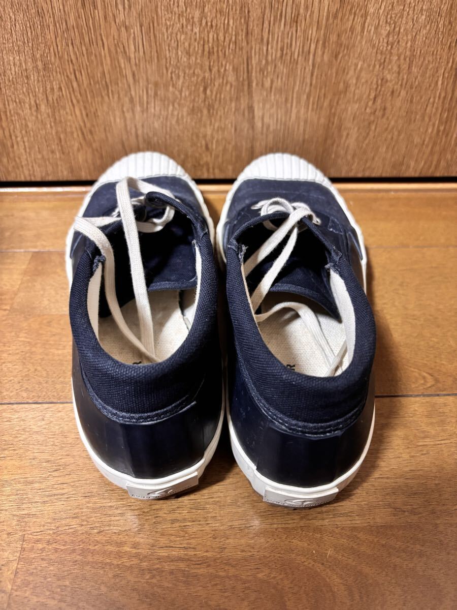 雨用に使用していました。購入は5年前でネイビーは最近見ないカラーです。年に5回くらいの使用でしたのでソールは2ミリくらいの減りです。長期保管の為、インソールも汚れています。神経質な方は入札をお控えください。