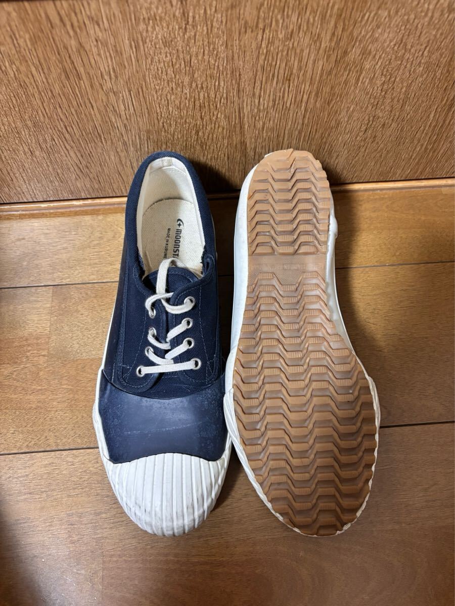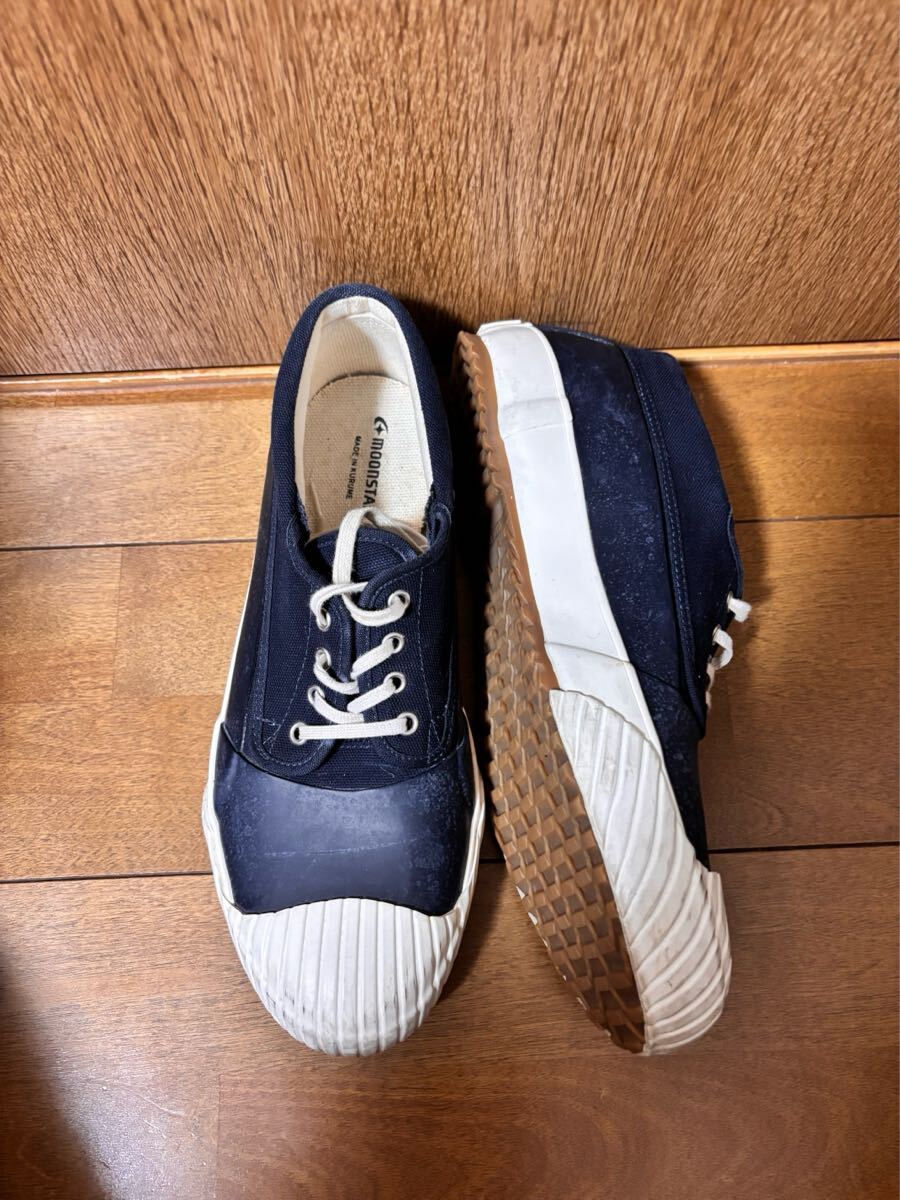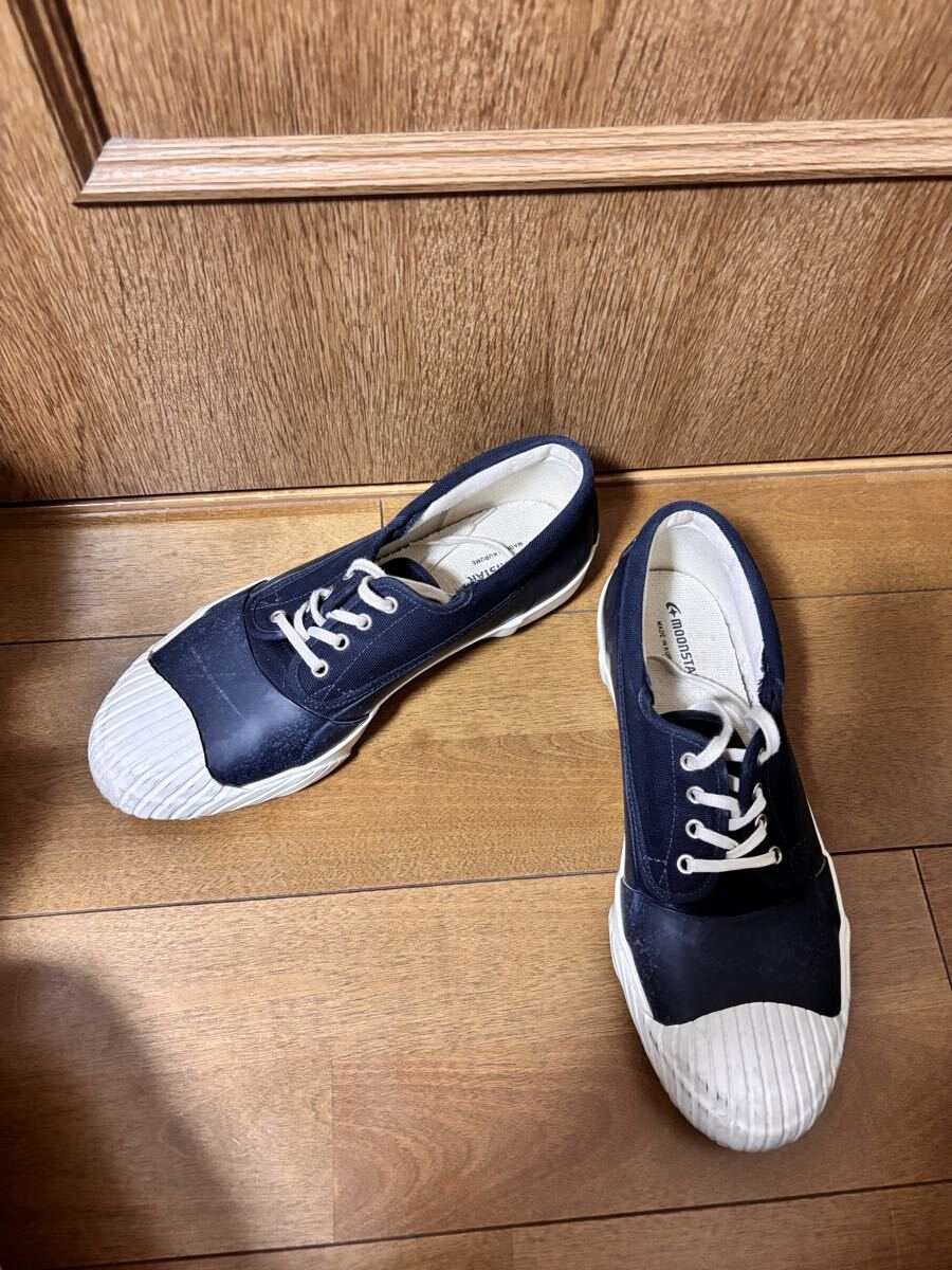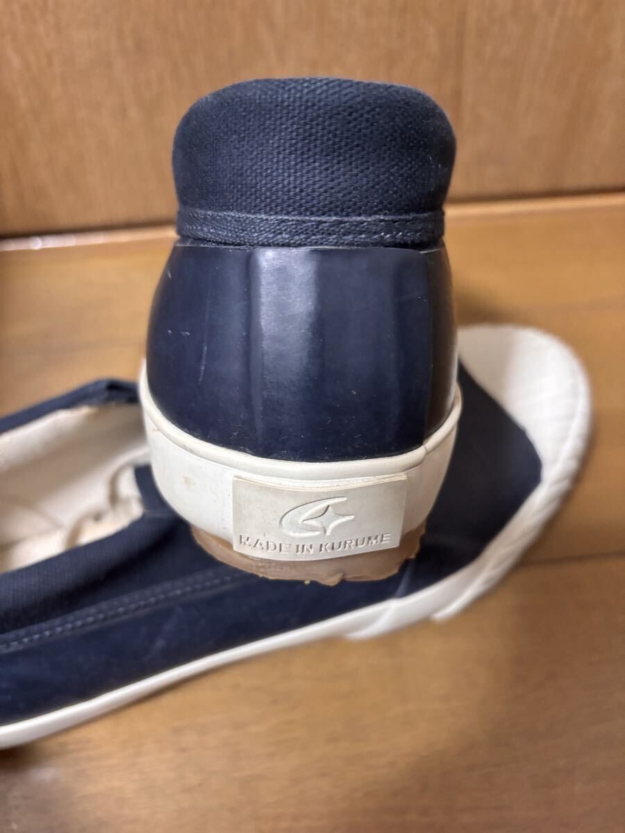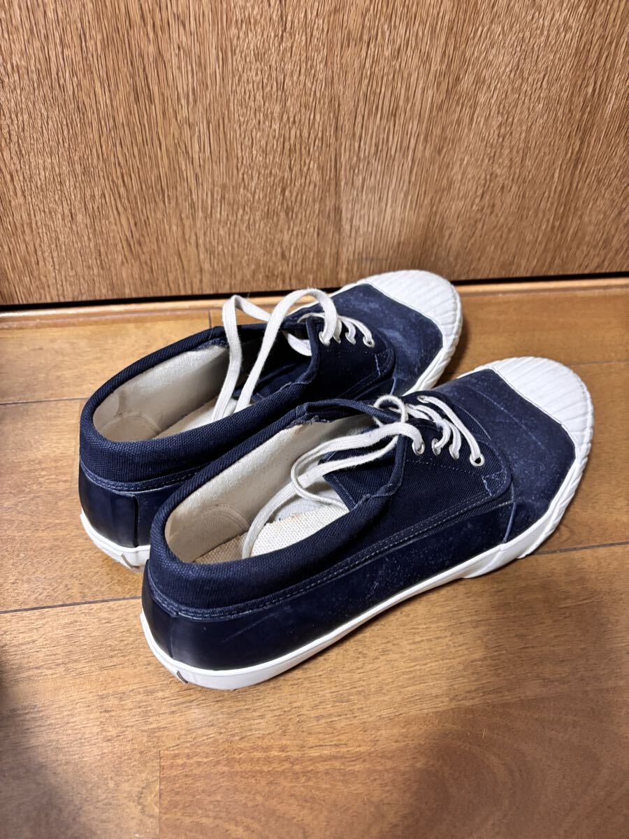 雨用に使用していました。購入は5年前でネイビーは最近見ないカラーです。年に5回くらいの使用でしたのでソールは2ミリくらいの減りです。長期保管の為、インソールも汚れています。神経質な方は入札をお控えください。