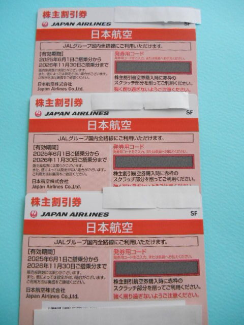 日本航空 JAL 優待割引券 2026‐11‐30日 ご搭乗分迄 3枚 送料無料。