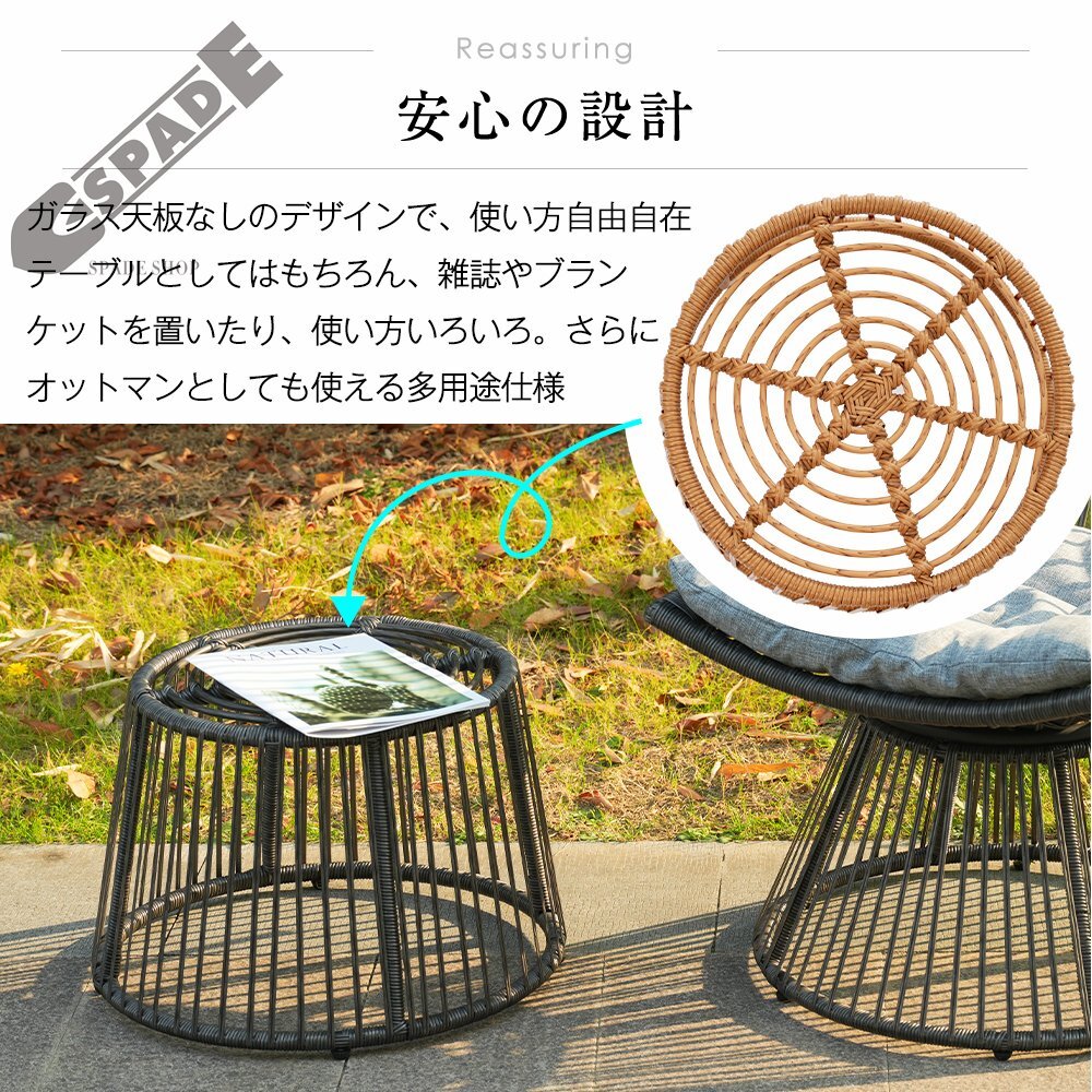 • 【安心の設計】ガラス天板なしのデザインで、使い方自由自在テーブルとしてはもちろん、雑誌やブランケットを置いたり、使い方いろいろ。さらにオットマンとしても使える多用途仕様 テーブル・チェアともに脚裏には高さ調整可能なアジャスター付き。地面のわずかな傾きにも対応し、ぐらつきを防ぎます。