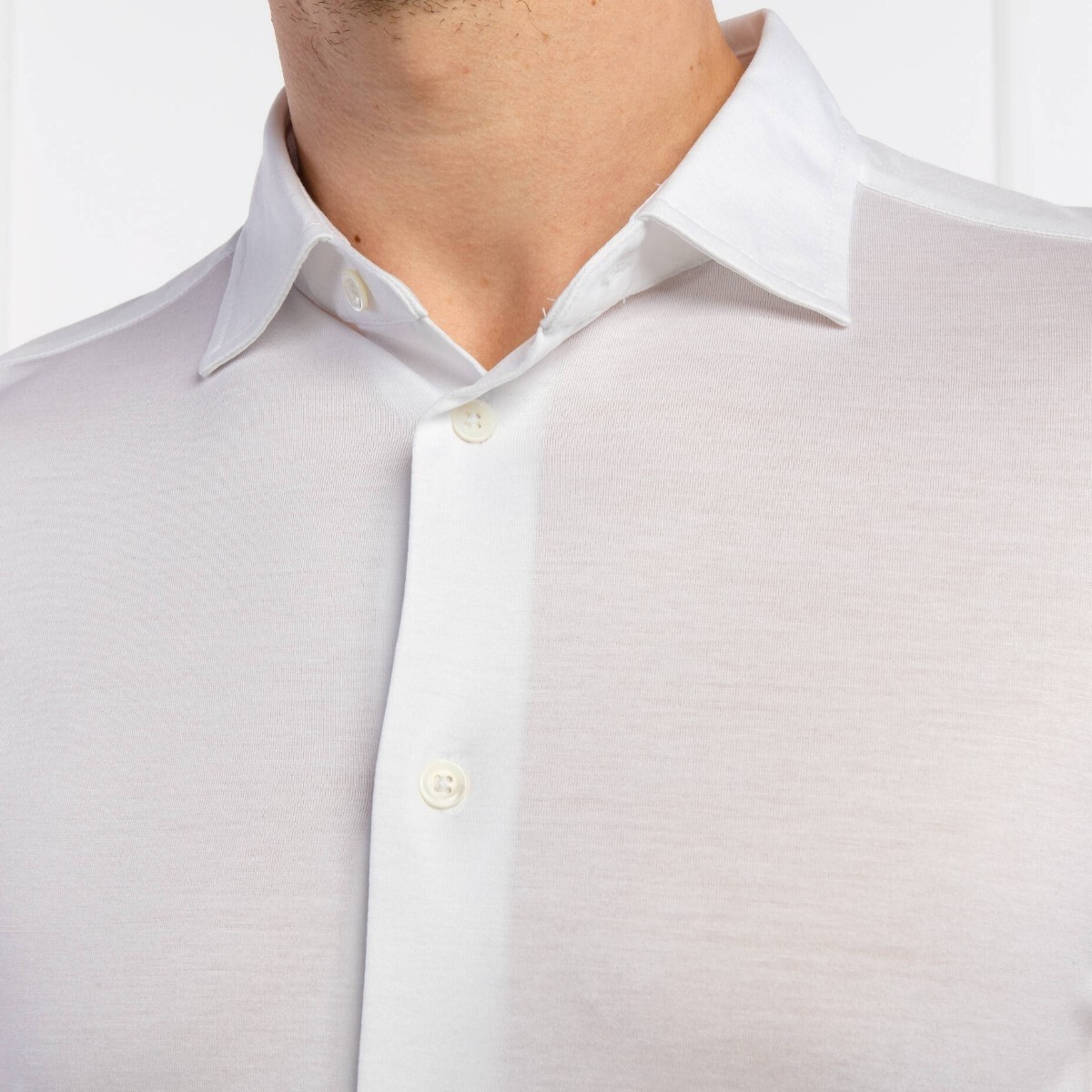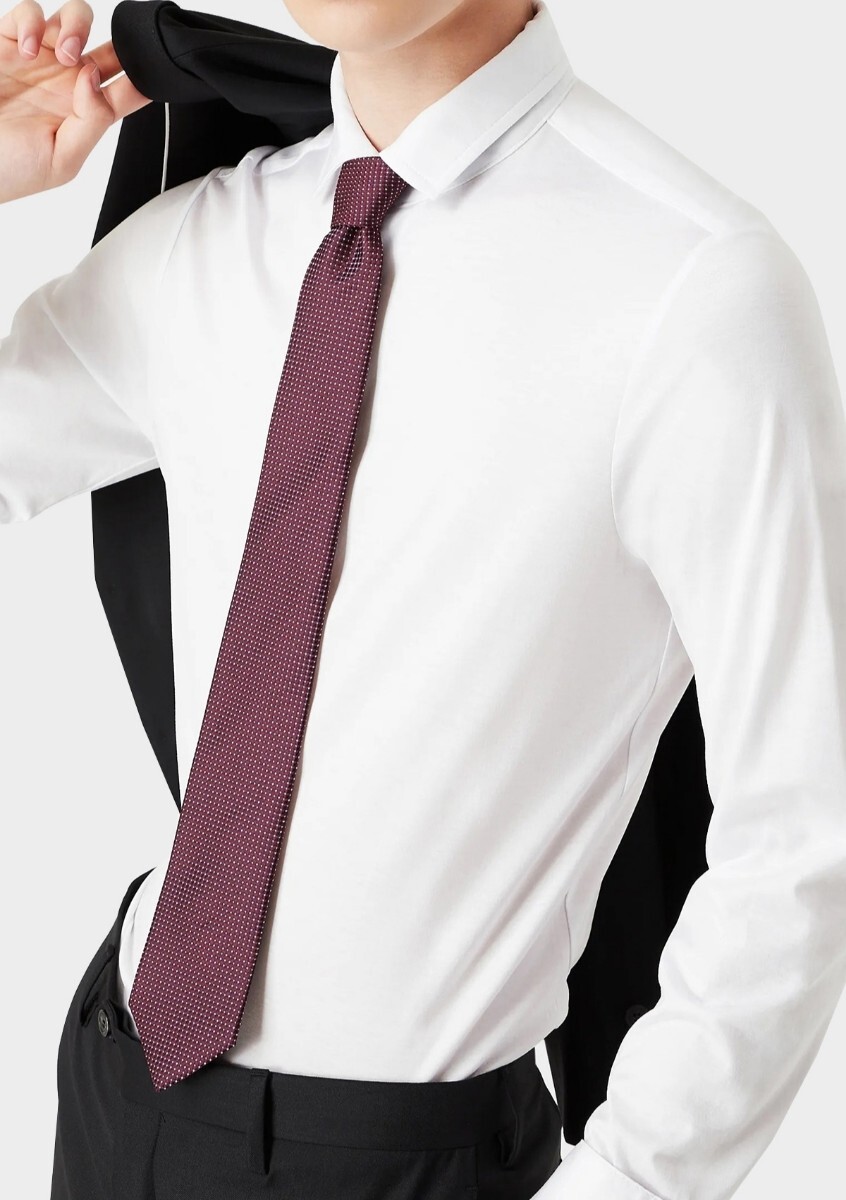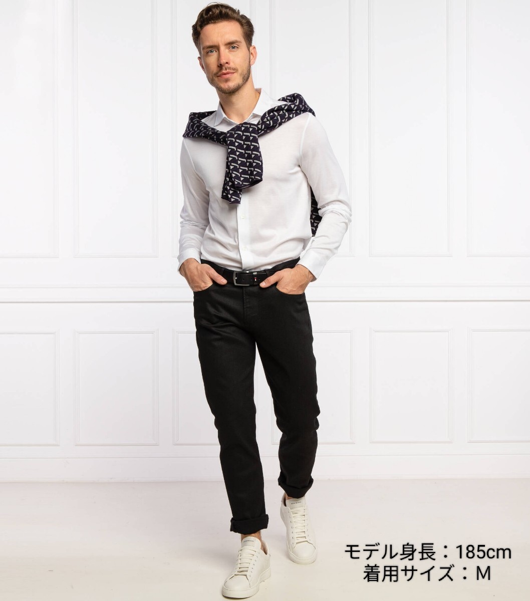 フィット感のあるジャージー素材を使用しており、着心地の良さも抜群。単体でさらりと着てもよし、ネクタイを締めてビジネスでも活躍する汎用性の高さが魅力的で、ジャケットやアウターを脱いでも抜かりない逸品です。