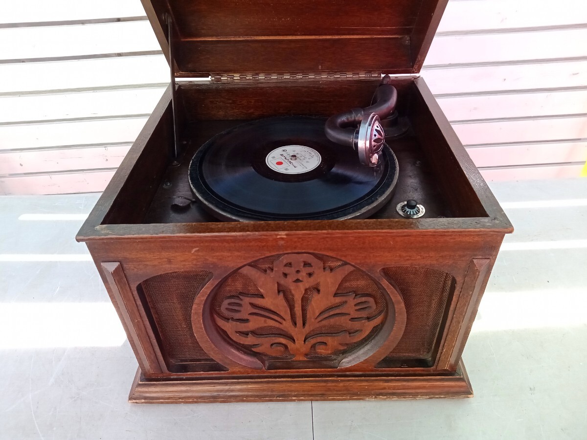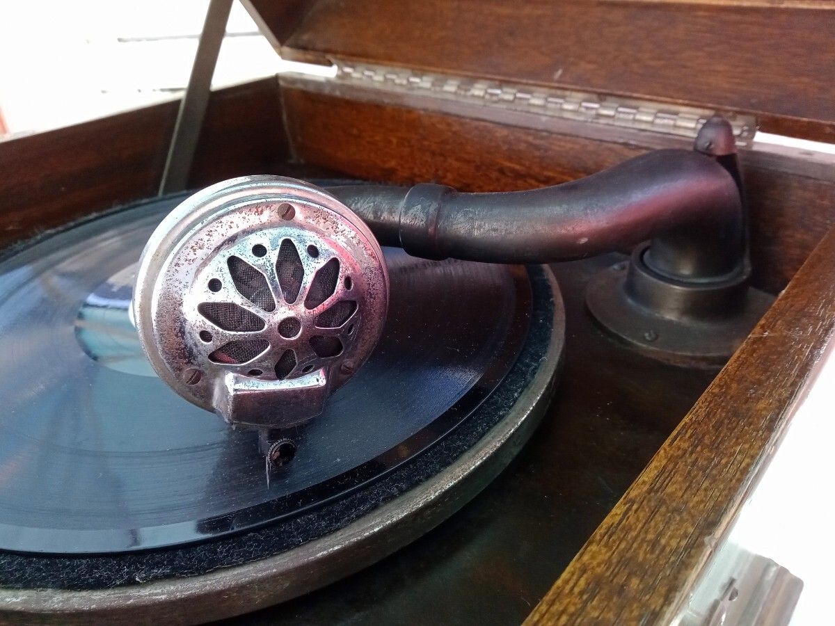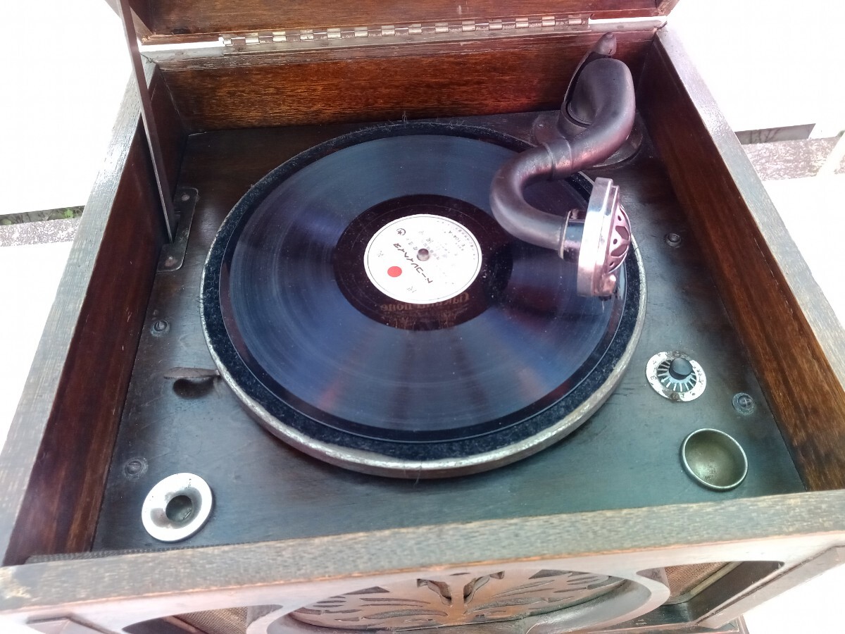 ★動作確認は、レバーにてゼンマイが巻けて、ターンテーブルが回転する、SP盤をかけての音出し、回転数の調節が出来るのは確認しました。その他の動作は未確認です。
