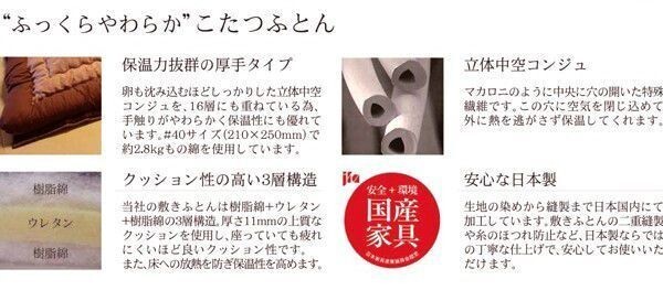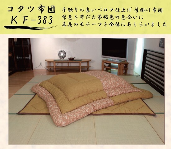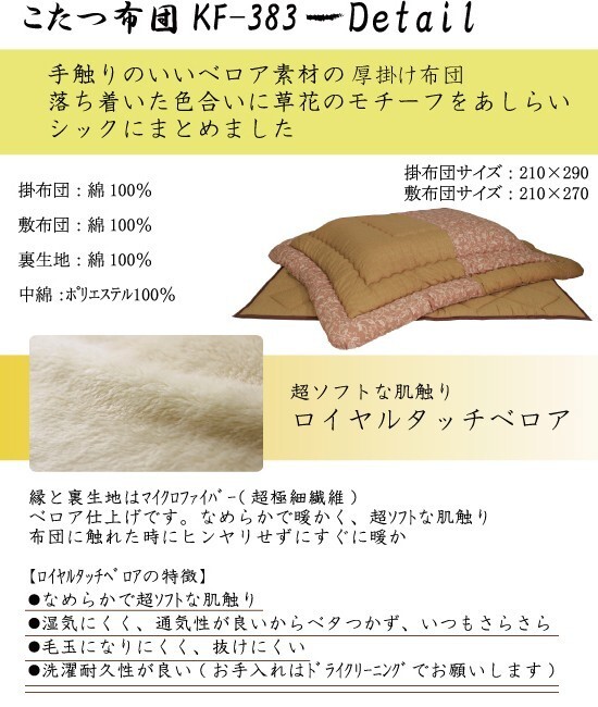 こたつ布団 長方形こたつ布団掛敷きセット 135~150センチ巾こたつ用 KF-383 国産品※手触りの良いベロア素材の厚掛け布団です※紫色を帯びた茶褐色の落ち着いた色合いに、草花のモチーフを全体にあしらいシックにまとめました※超ソフトな肌触りのロイヤルタッチベロアを使用しております※湿気にくく、通気性が良くベタつかずいつもサラサラです※毛玉になりにくく抜けにくい素材※洗濯耐久性が良い(お手入れはドライクリーニングでお願いします)◇掛布団:綿100%◇敷布団:綿100%◇裏生地:綿100%◇中綿:ポリエステル100%◇ロイヤルタッチベロア ◇掛布団サイズ:幅210×奥行290センチ◇敷布団サイズ:幅210×奥行270センチ《4日~5日(土日除く)での発送となります》☆落札、ご入金確認後 1~2日にて発送いたします 追加納期のかかるものは商品ページに記載いたしております よろしくお願いいたします。