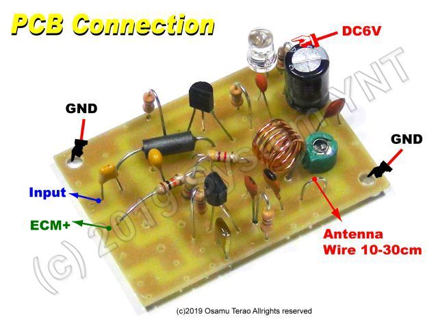 このFMトランスミッター基板はそういう用途で設計したもので、簡単な回路ですが閉ざされた別室からのネットラジオ(PCの出力)を湿度100%空間のお風呂場ラジオまで届けます。想定電源は5-6V、電池がベストですがUSB電源でも動きます。完全デスクリートでコイルが自作のため周波数の設定もフリー。簡単に出来て、古い(1940年代・米国製)真空管式FMラジオ(受信周波数:42-50MHz)や各種アマ無線の受信機にも使える自由度が高いDIY基板です。試験機の動作概要は以下のとおり;