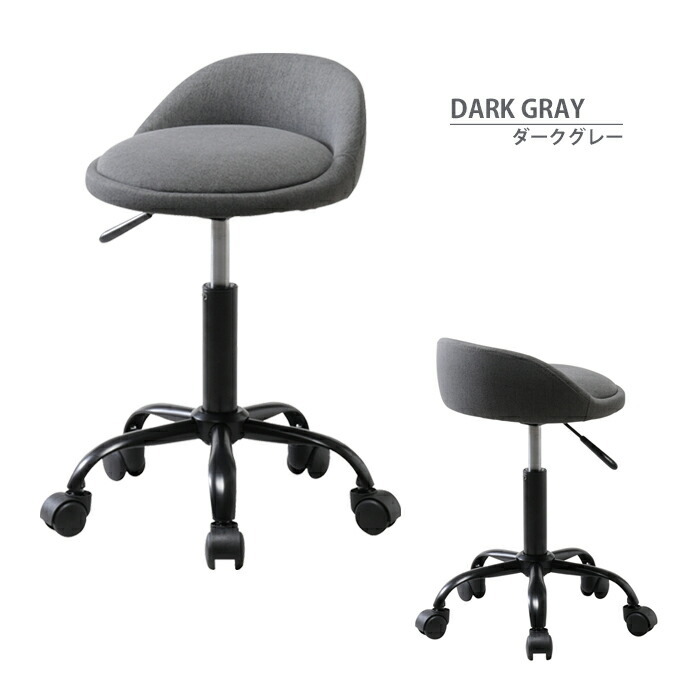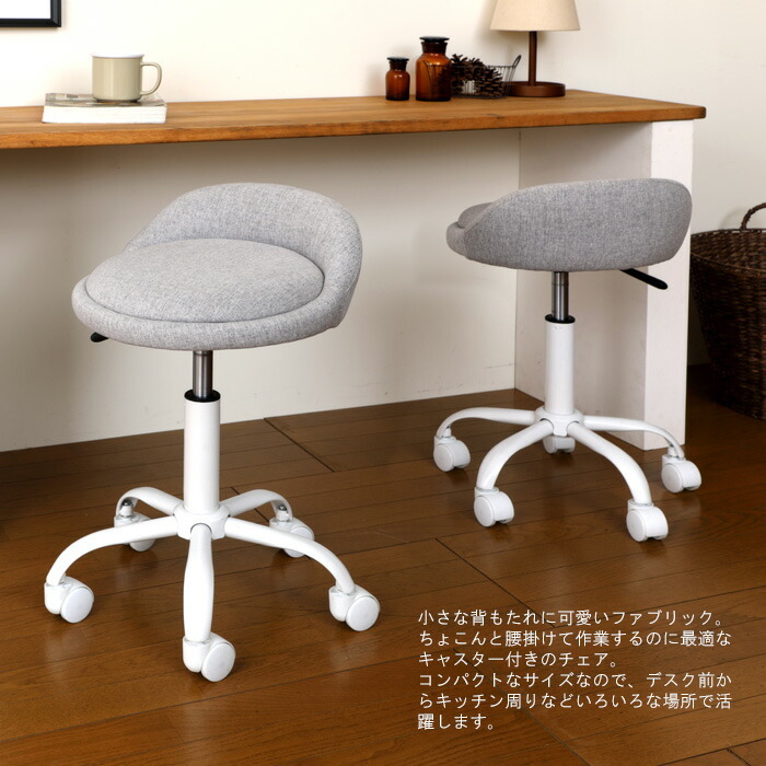 | キャスターの付いた可愛いファブリックのチェア。 デスク前からキッチン回りなどいろいろな場所で活躍します。 座昇降(ガスシリンダー式)機能付き。 |