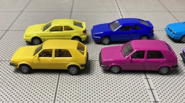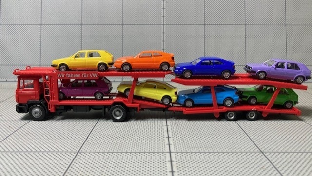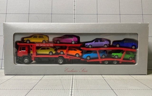 1/87 Herpa MAN F90 Autotransporter + 4 Golf & 4 Corrado "Wirfahren fur VW"