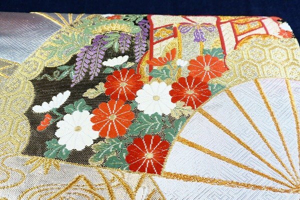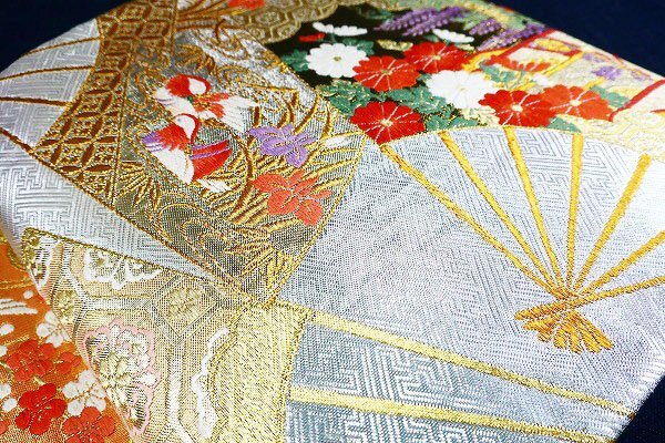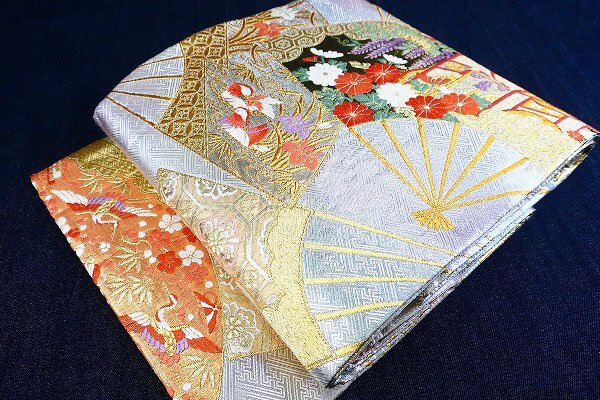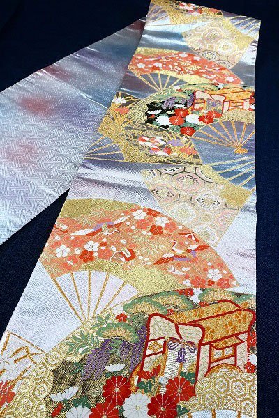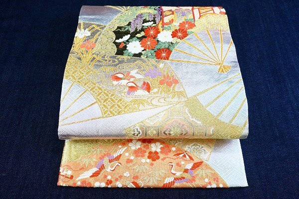 シルバー地に、金色の扇面に鶴や吉祥花、御所車等が織り込まれた袋帯です。 |