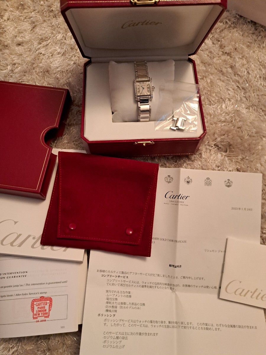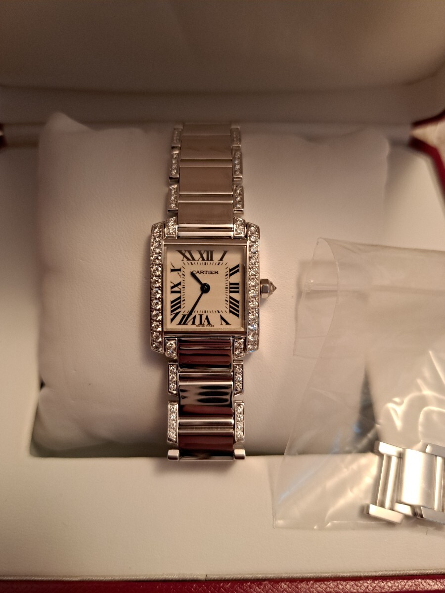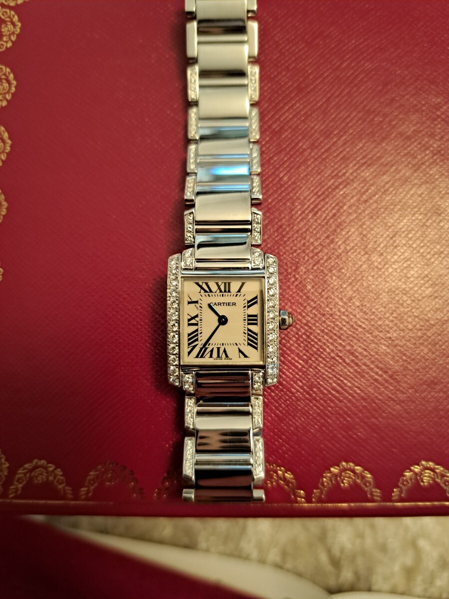 ★★★カルティエの永遠のベストセラー、タンクフランセーズSMホワイトゴールドのこちらはブレスにもダイヤが入った大変美しいジュエリーウォッチです。もちろんアフターではなくカルティエの最高のダイヤモンドが施されており会う人の視線を釘付けにする逸品でこちらの時計一つで他のジュエリーは不要です。ブレスには目に見える範囲にダイヤが入っております。購入後10回程度の使用ですが昨年カルティエにてオーバーホールを完了しており新同の状態です。現行16センチくらいの腕回りですが余りコマが付属しますので17,5位までサイズ調整可能です。リサイクルショップで持ち主が何人かわからないお品でなく私が購入し大切にメンテをして保管しておりましたのでご安心の上ご検討下さいませ。現在は廃盤で定価は不明ですが購入時で470万ほどでしたので現行で同タイプでしたら700万くらいするかと思います。高額品に尽き信頼頂ける方、信頼できる方に是非ご検討いただきたいお品です。