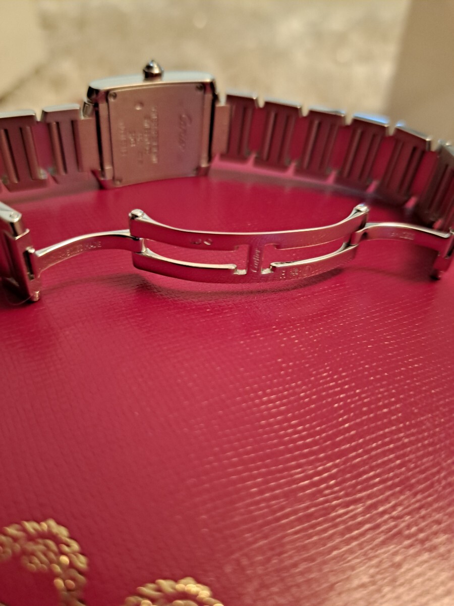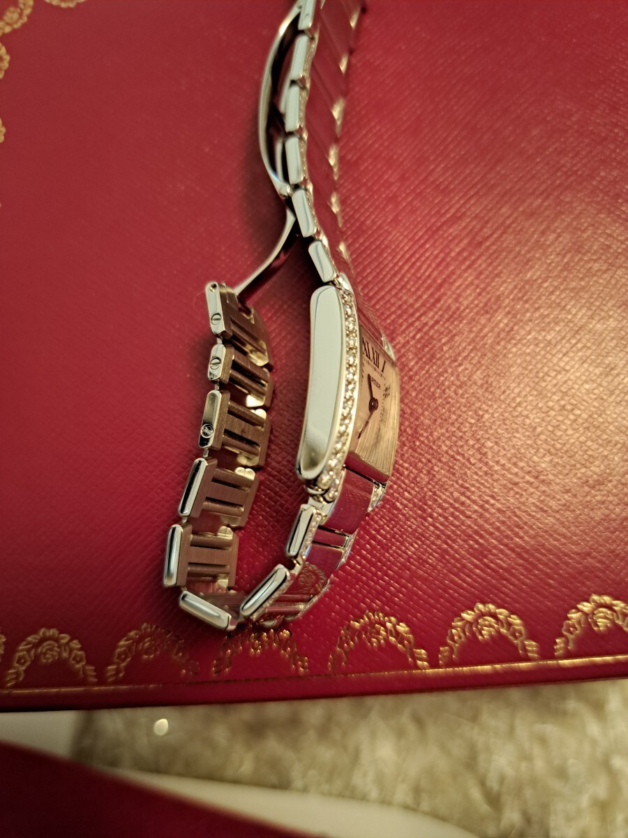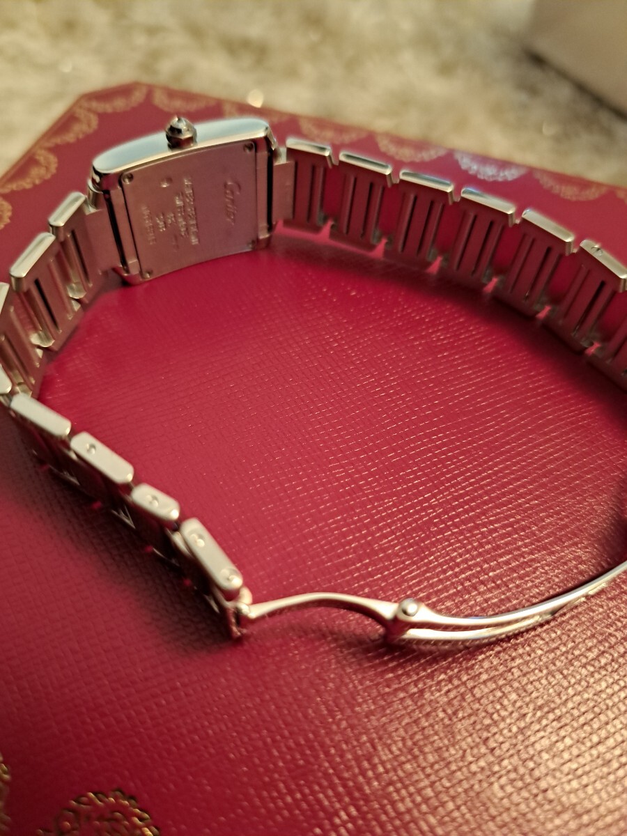 ★★★カルティエの永遠のベストセラー、タンクフランセーズSMホワイトゴールドのこちらはブレスにもダイヤが入った大変美しいジュエリーウォッチです。もちろんアフターではなくカルティエの最高のダイヤモンドが施されており会う人の視線を釘付けにする逸品でこちらの時計一つで他のジュエリーは不要です。ブレスには目に見える範囲にダイヤが入っております。購入後10回程度の使用ですが昨年カルティエにてオーバーホールを完了しており新同の状態です。現行16センチくらいの腕回りですが余りコマが付属しますので17,5位までサイズ調整可能です。リサイクルショップで持ち主が何人かわからないお品でなく私が購入し大切にメンテをして保管しておりましたのでご安心の上ご検討下さいませ。現在は廃盤で定価は不明ですが購入時で470万ほどでしたので現行で同タイプでしたら700万くらいするかと思います。高額品に尽き信頼頂ける方、信頼できる方に是非ご検討いただきたいお品です。