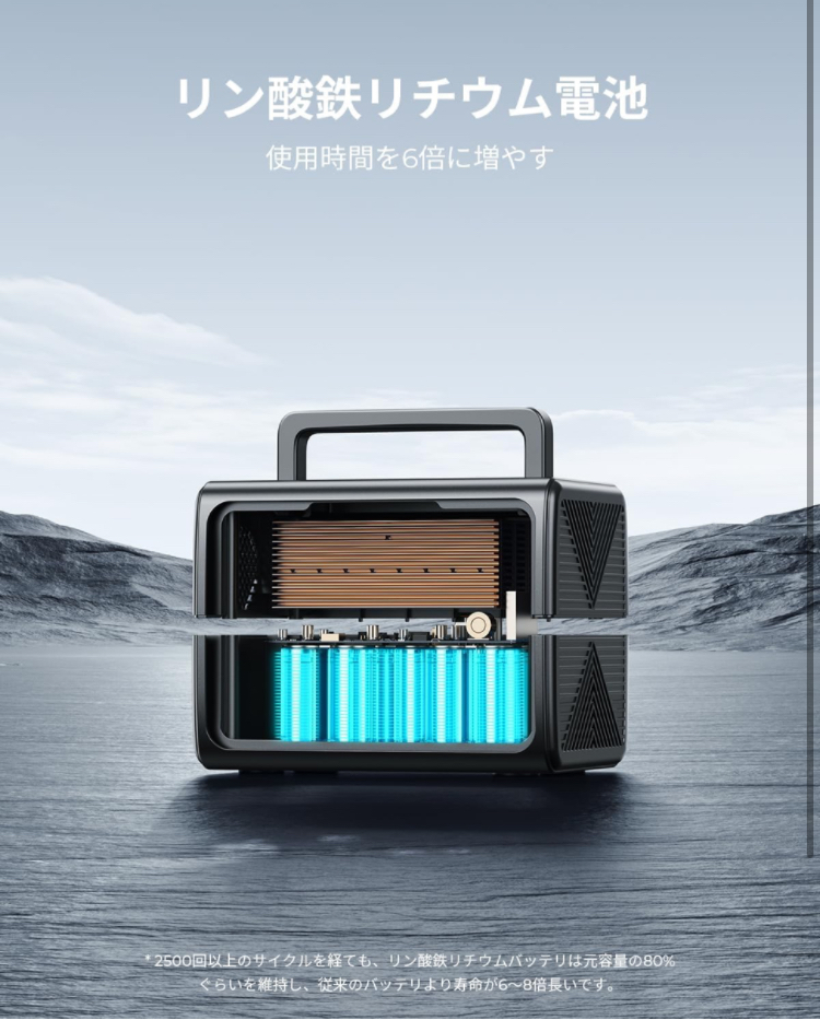 普通のリチウムイオン電池の寿命が3〜5年なのに対して、こちらのリン酸鉄リチウムイオン電池は6〜10年が寿命で若干値段は上がりますが、約倍の寿命があります。