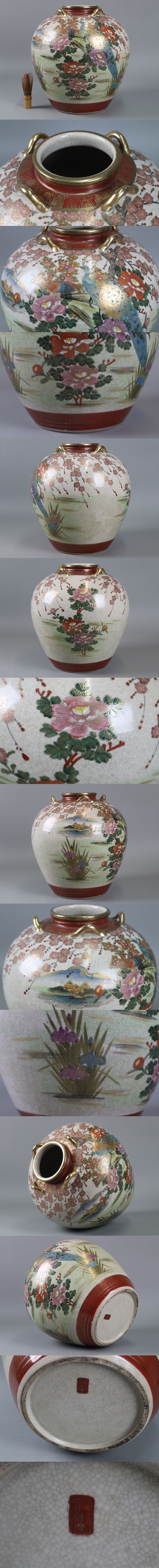 【薩摩焼 丸十薩摩 金彩色絵花鳥図 四つ耳 壷 置物 高32,3cm 幅31,5cm】
