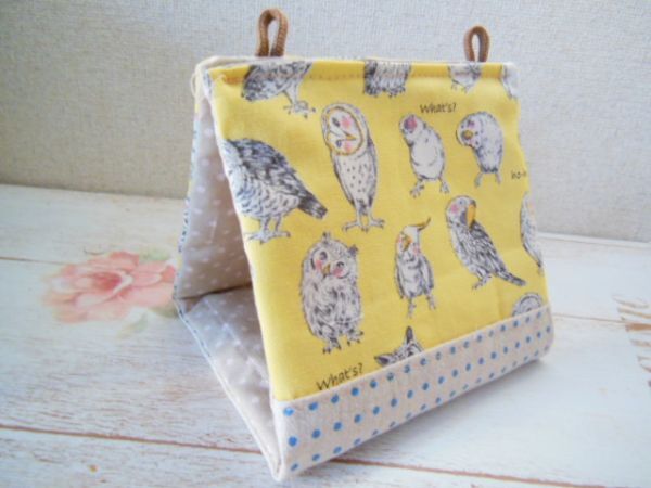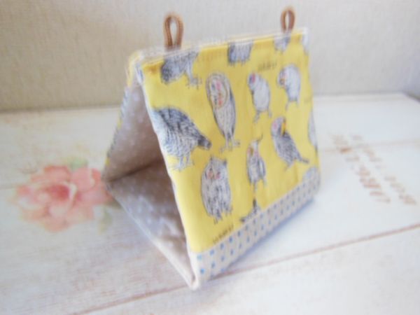| ご覧いただきありがとうございます。 ハンドメイドで、綿生地を使い、コザクラインコさんや文鳥さんサザナミさんサイズのバードテントを作りました。 内側にキルトを挟みふんわりしています。内布は綿麻リネンを使っています。 サイズ・・・横間口約10 高さ12 奥行き12センチcm | ○ 発送詳細○