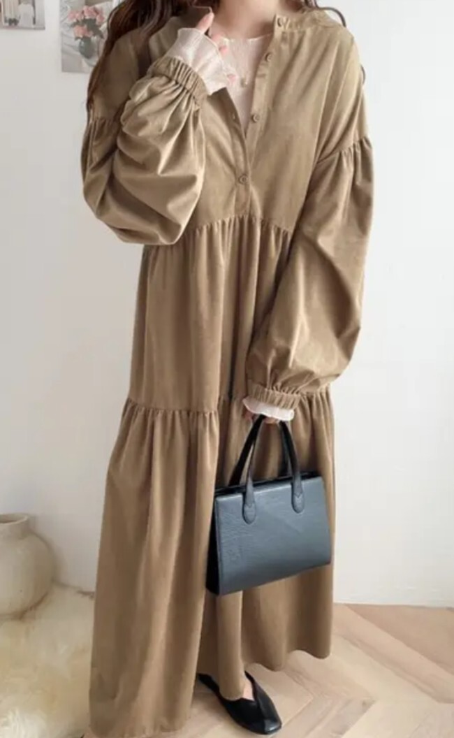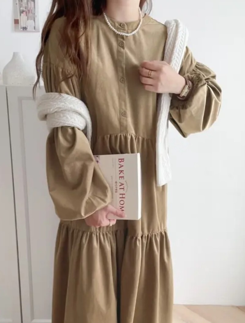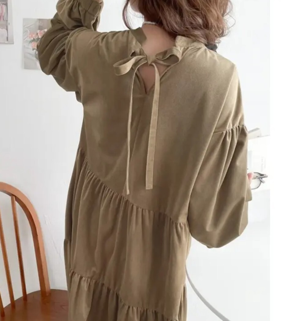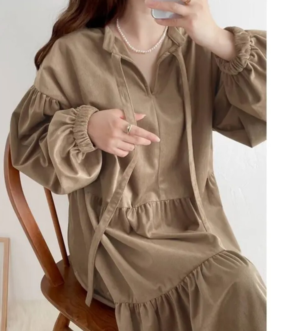■point ・前後2wayで着られる ・ティアードデザイン ・ボリュームスリーブ ・バックリボン ■detail 大人気、ボリュームたっぷりなティアードワンピースにAW素材の新作が登場。 ベロアタッチのしっかりとしたコーデュロイ生地は高見えするのが嬉しい! バックリボン付きで前後2wayで着られるのもポイントです。 360°どこから見ても可愛いトレンドのティアードデザインで、 大人の魅力溢れる上品見えが叶う一着です。 たっぷりボリュームスリーブが旬な着こなしを演出し、 こなれ感溢れるルックスに♪ ■fabric ベロアタッチなキレイ目の細コーデュロイ生地