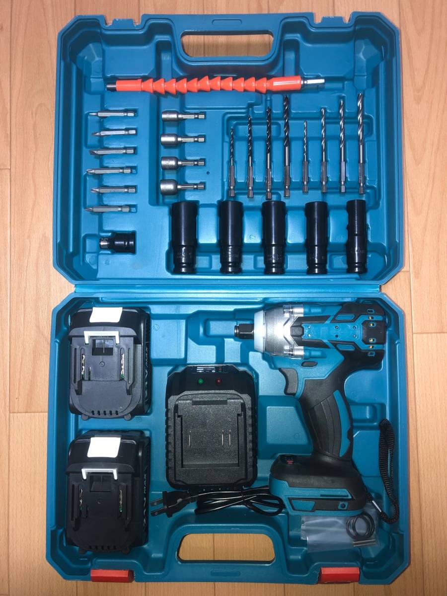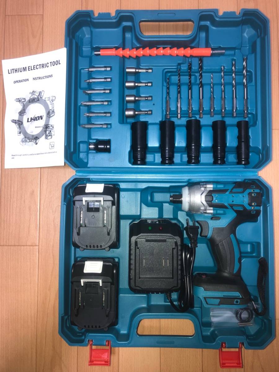 付属品:本体x1、専用ケースx1、大容量バッテリーx2個(21V 4.0Ah)、充電器x1、ソケットレンチ5本(14/17/18/19/21mm)、六角軸ソケットx4本(6/8/10/12mm)、六角軸鉄工用ドリルx4本、六角軸木工用ドリルx4本、六角軸ドライバビットx6本、六角軸 延長ビットx1、六角軸転換アダプターx1、Oリングガスケットx1、説明書、(商品写真最後一枚全てです)