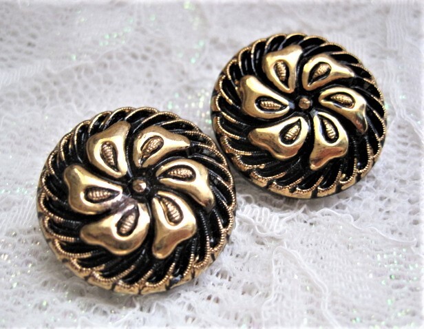 ★チェコ■金彩お花 ブラックガラスボタン 2個セット 約2.3㎝ G-13857 ハンドメイド ヴィンテージ