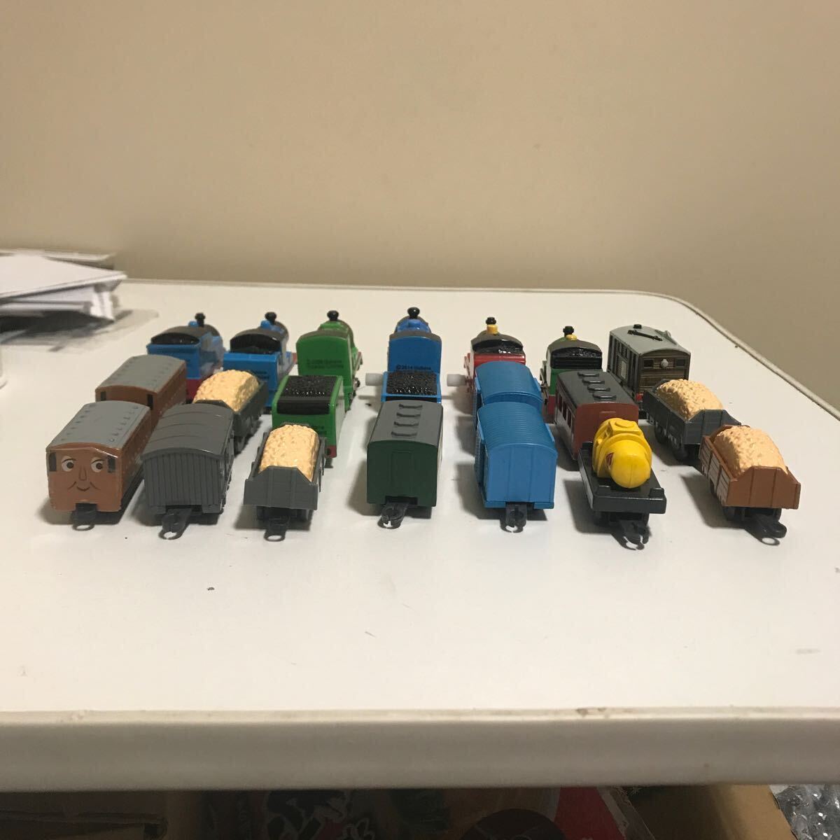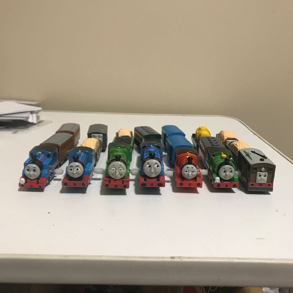 トーマス、エドワード、ヘンリー、ゴードン、ジェームス、パーシー、トビー、アニーとクララベル、客車、貨車類セットになります。
