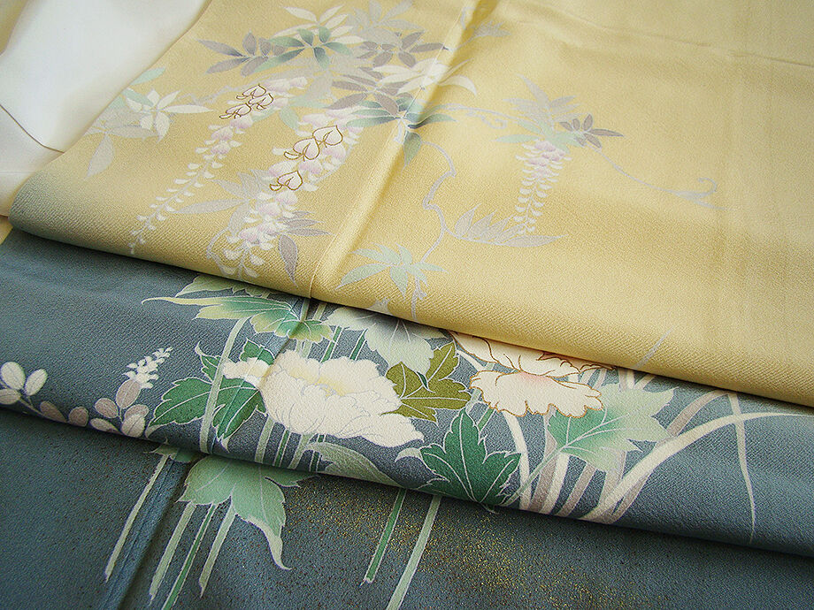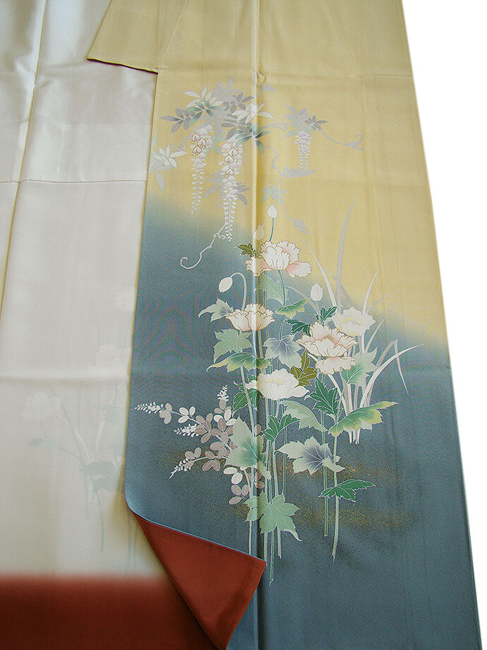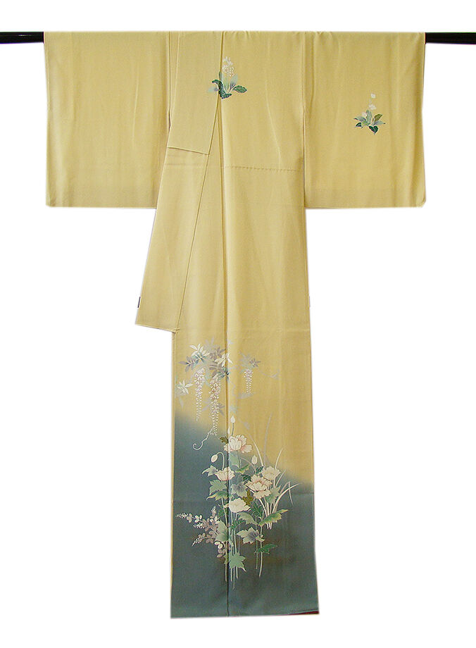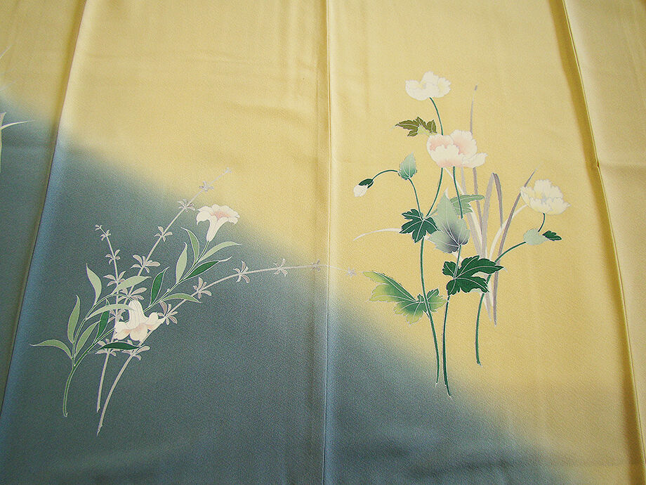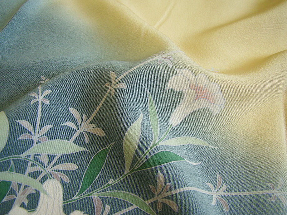 | 商品説明 | こちらのお品は「袷」ですので10月から5月までお召頂ければと思います。 大変にしなやかで柔らかな手触り良い滑らかな重めの極上ちりめんの生地となっております。 クリーム色地に裾にかけて藍鼠色ぼかし染に、白、緑、薄ピンク、灰色等の花木柄の本加工染、 八掛は煉瓦色(正絹)、幅広い年代の方にお召頂けます。 |