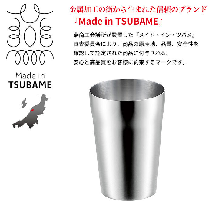 | 金属加工の街から生まれた信頼のブランド「Made in TSUBAME」 粋に味わう、シンプルデザインのタンブラー。 「Made in TSUBAME」は燕商工会議所が接地した「メイド・イン・ツバメ」の審査委員会より、商品の原産地、品質、安全性を確認して認定された商品に付与される、安心と高品質をお客様にお約束するマークです。 |
