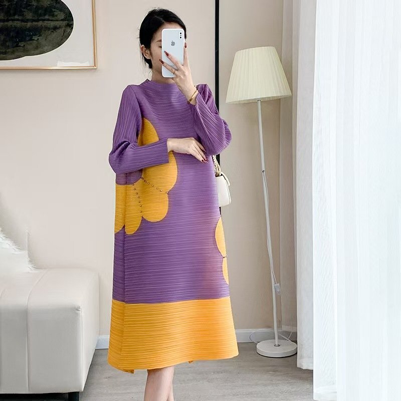 LRM4395★新品トップス ロングワンピースチュニック プリーツ弾力があり 素敵柄ピース飾り