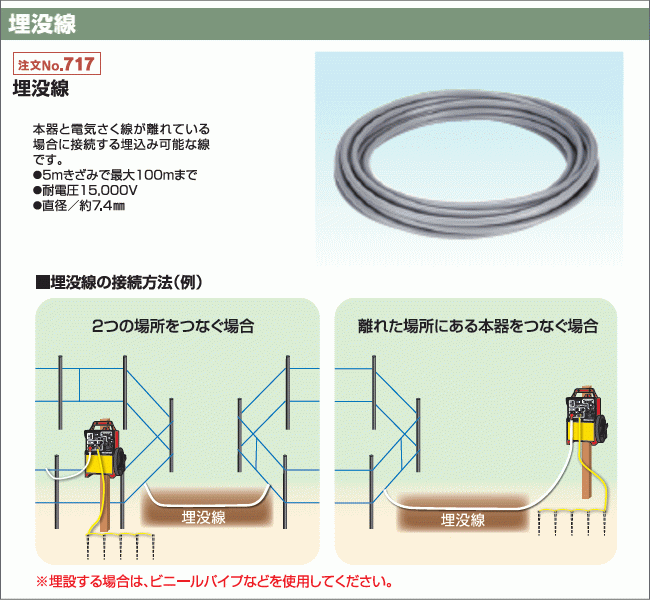 | 本器と電気柵線が離れている場合に接続する埋め込み可能な線です。 |